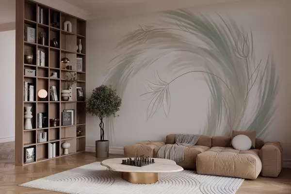 Papel tapiz Plumas y flores verdes y beige, pintadas a mano Nr. w04816