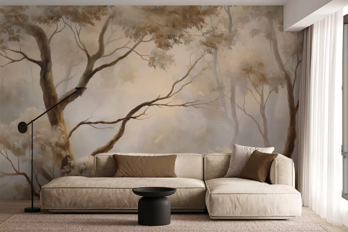 Papel tapiz El bosque envuelto en la ligera niebla matinal. Una delicada pintura atmosférica al estilo de un paisaje artístico. Nr. w04817