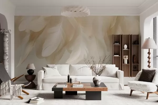 Papel tapiz Plumas colgantes exuberantes y delicadas en tonos relajantes. Nr. w04842