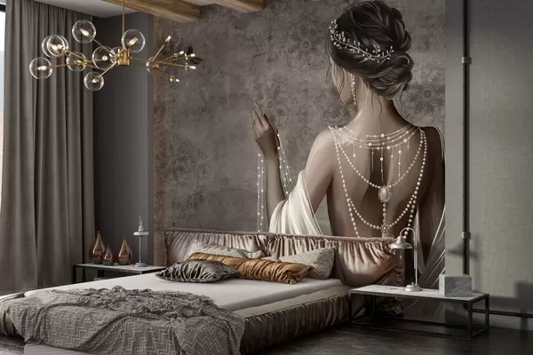 Papel tapiz Mujer vista desde atrás con perlas, fondo con patrón de piedras grises Nr. w04854