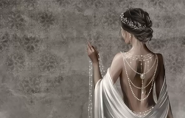 Papel tapiz Mujer vista desde atrás con perlas, fondo con patrón de piedras grises Nr. w04854