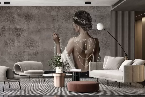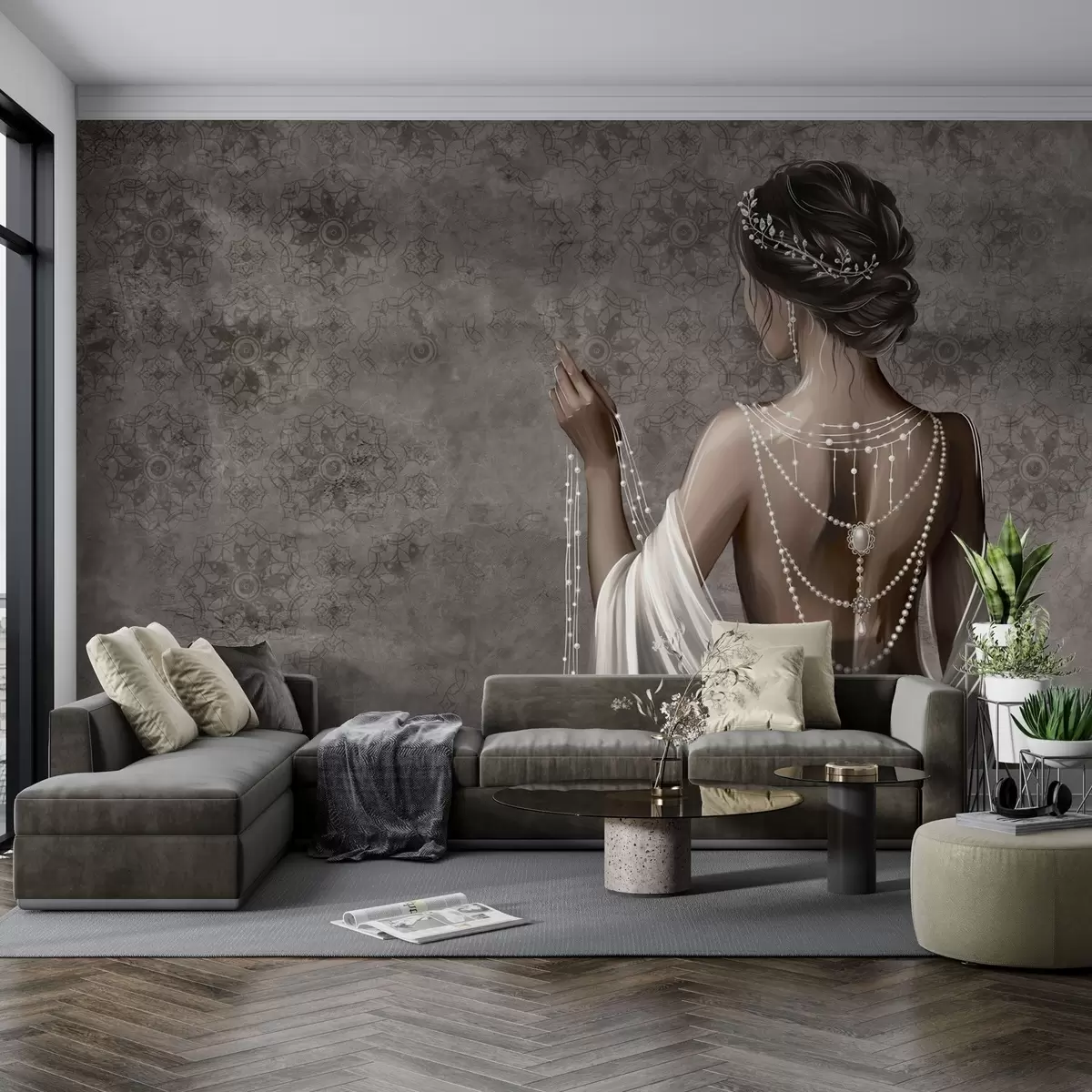 Papel tapiz Mujer vista desde atrás con perlas, fondo con patrón de piedras grises Nr. w04854