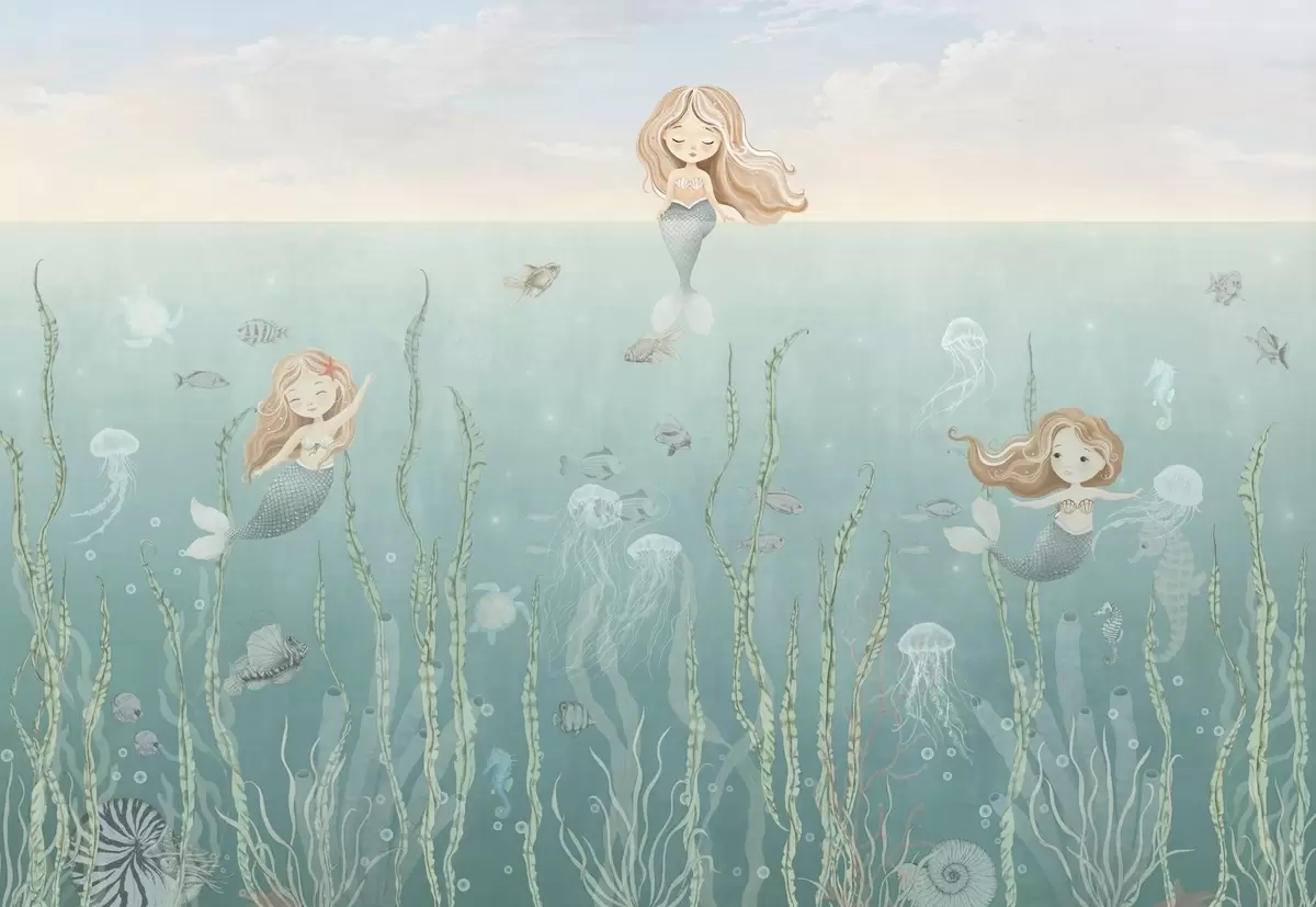 Papel tapiz Sirenas juguetonas bajo el mar con algas, medusas y peces. Nr. w04860