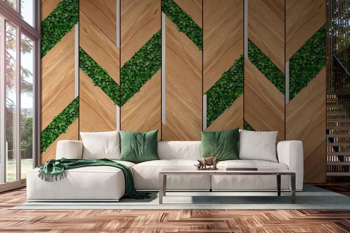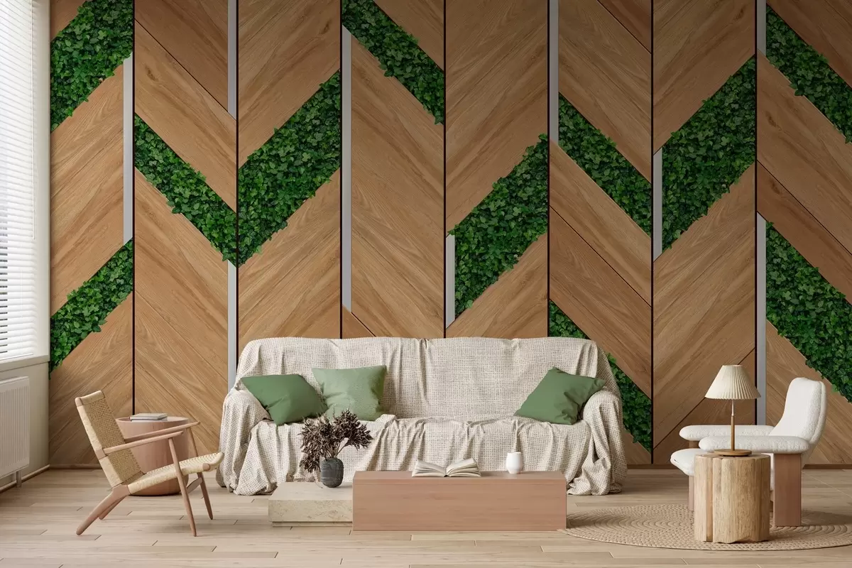 Papel tapiz imitación de paneles de madera clara con inserciones vegetales Nr. w04875