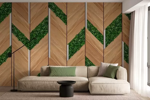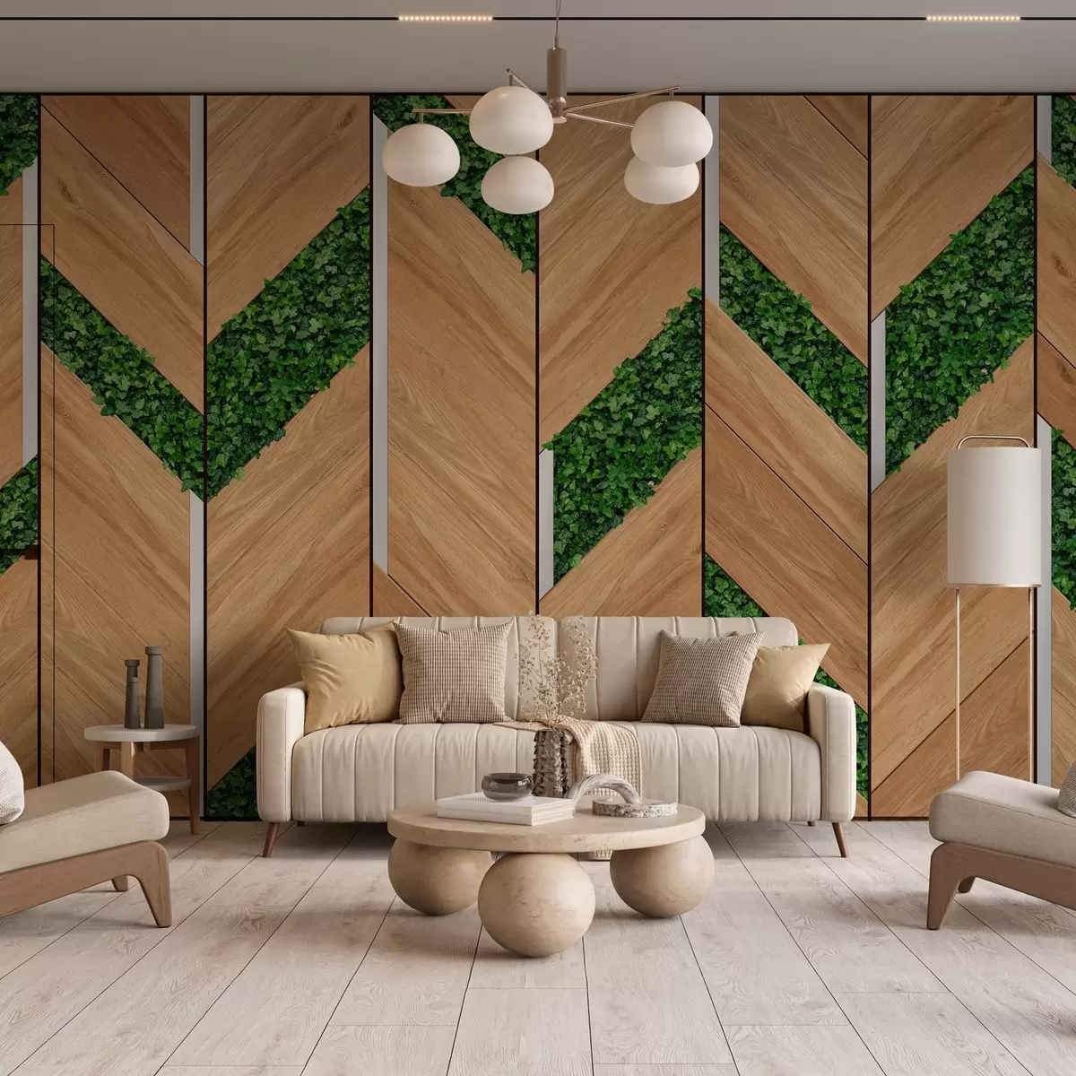 Papel tapiz imitación de paneles de madera clara con inserciones vegetales Nr. w04875
