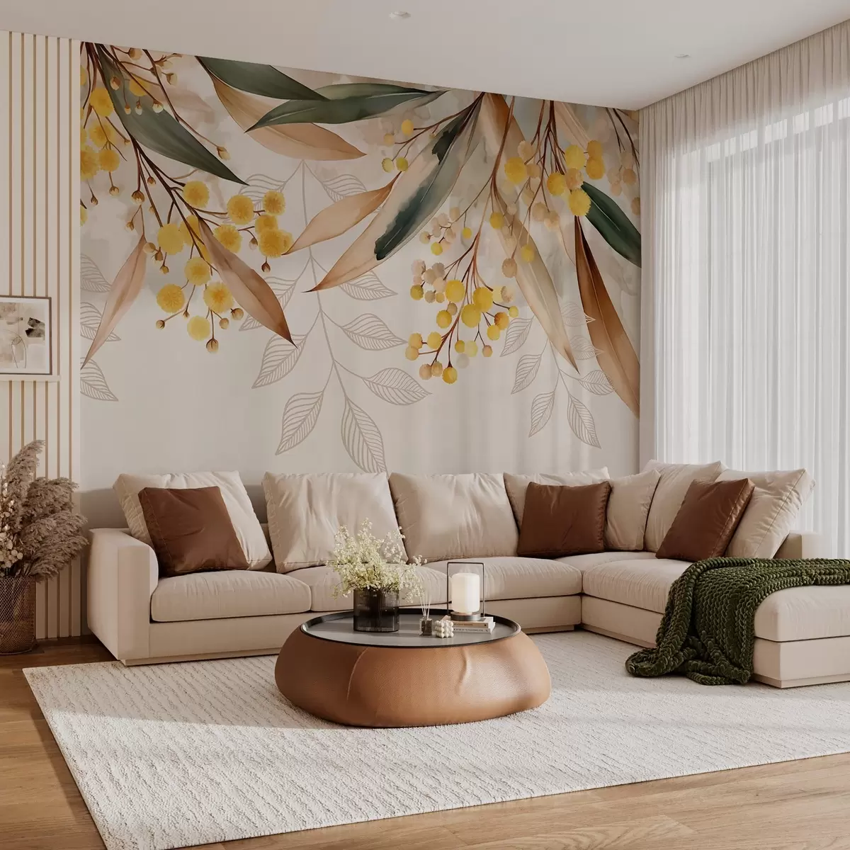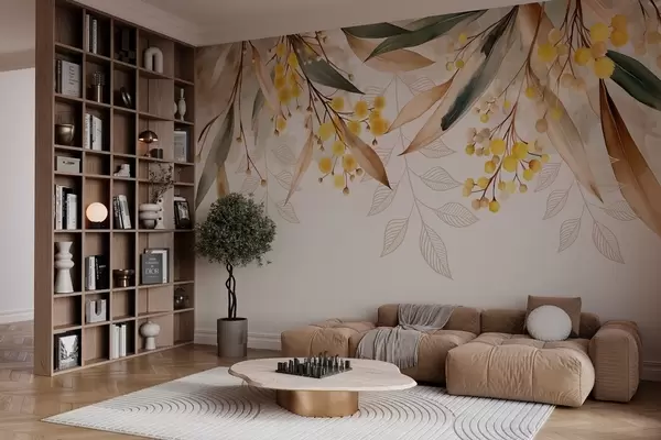 Papel tapiz flores y hojas de mimosa cayendo desde arriba en estilo acuarela Nr. w04880