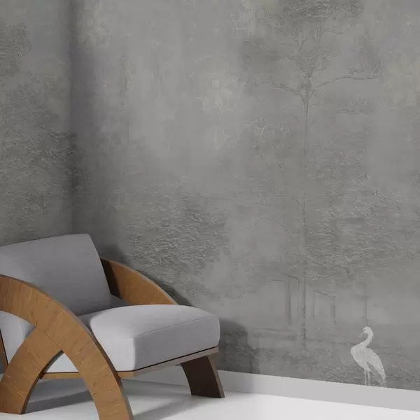 Papel tapiz Bosque ligero y brumoso con una garza en tonos grises fríos Nr. w04953v2