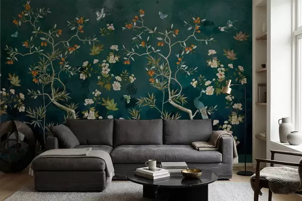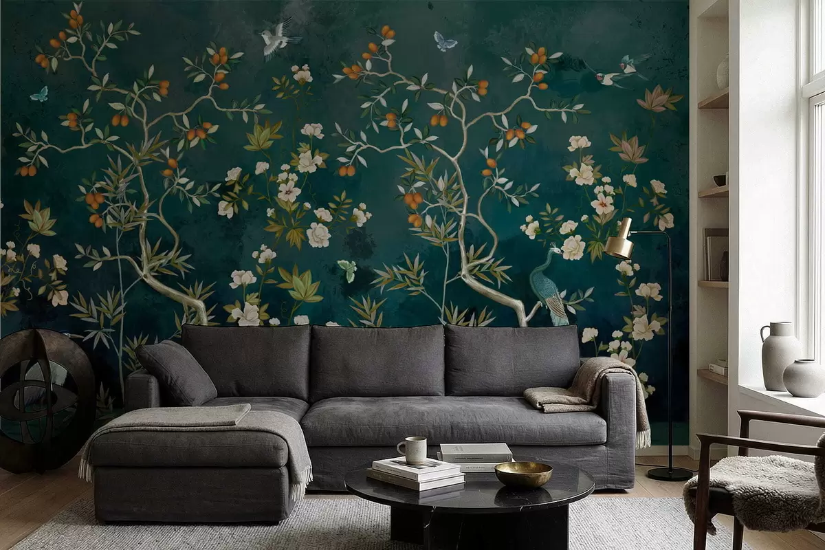 Papel tapiz Escena decorativa con árboles, flores y pájaros sobre fondo oscuro. Nr. w05004