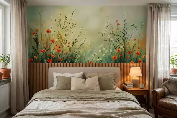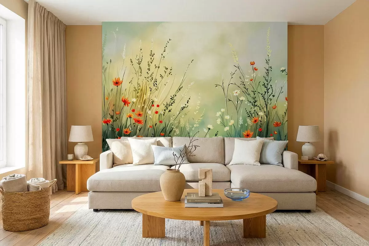Papel tapiz Flores y hierbas del prado en un estilo pictórico suave. Nr. w05015