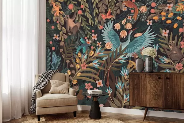 Papel tapiz Escena fantástica con pájaros y animales entre plantas Nr. w05024