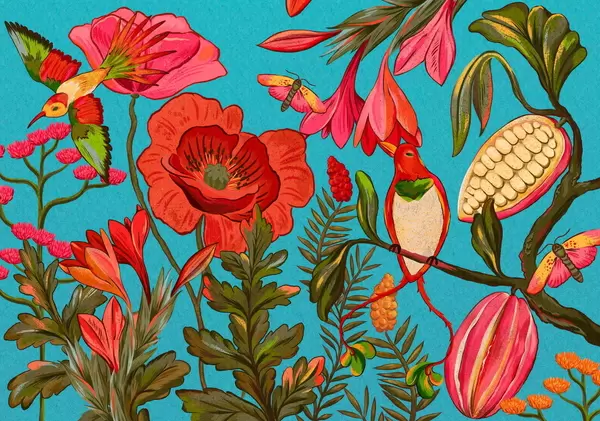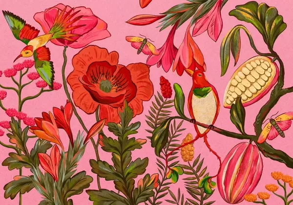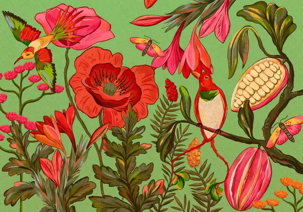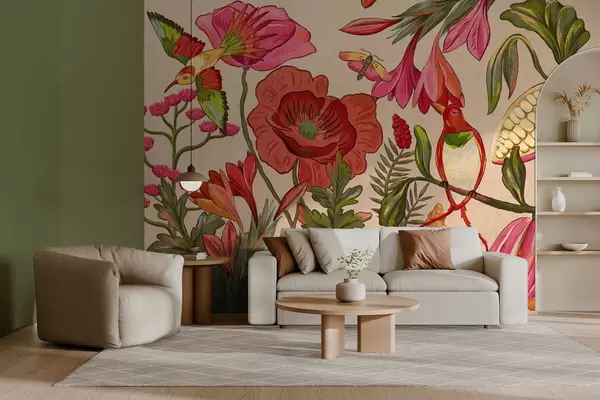 Papel tapiz Flores y pájaros decorativos sobre fondo beige Nr. w05036