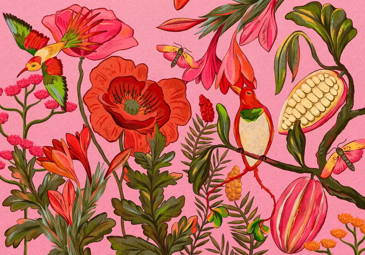 Papel tapiz Flores y pájaros decorativos sobre fondo rosa Nr. w05036v2