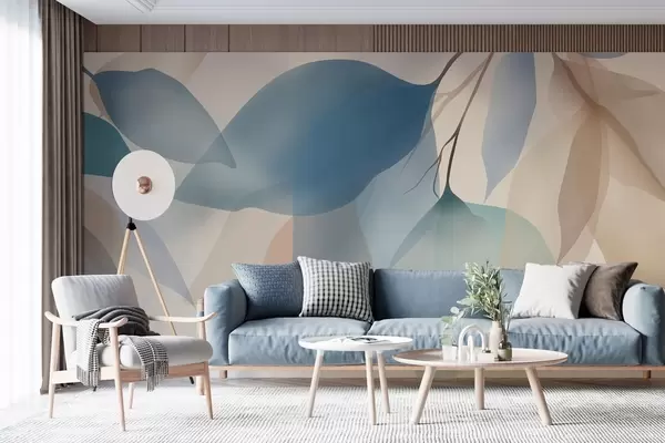 Papel tapiz elegantes hojas semitransparentes en tonos azules y beige Nr. w05060