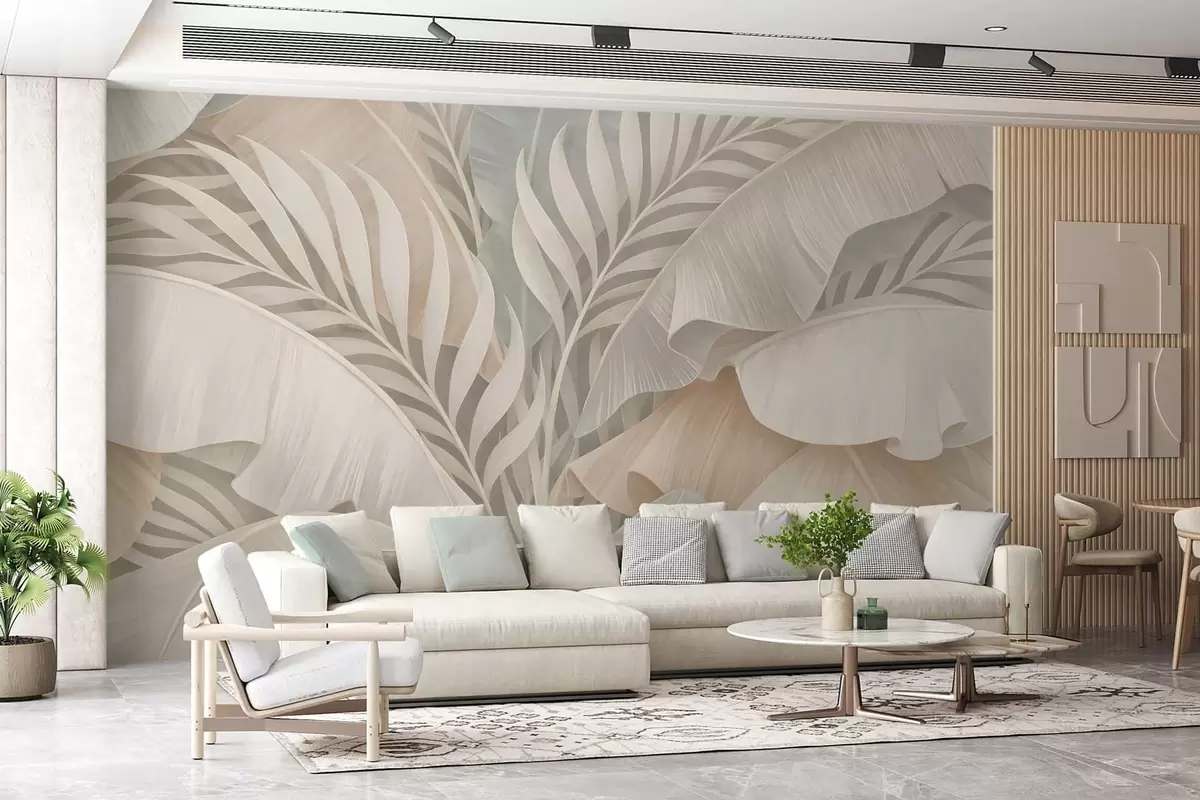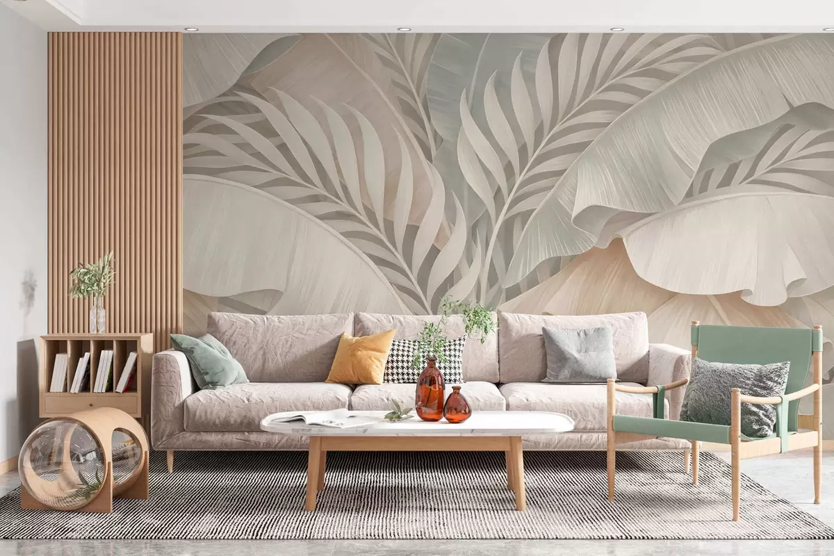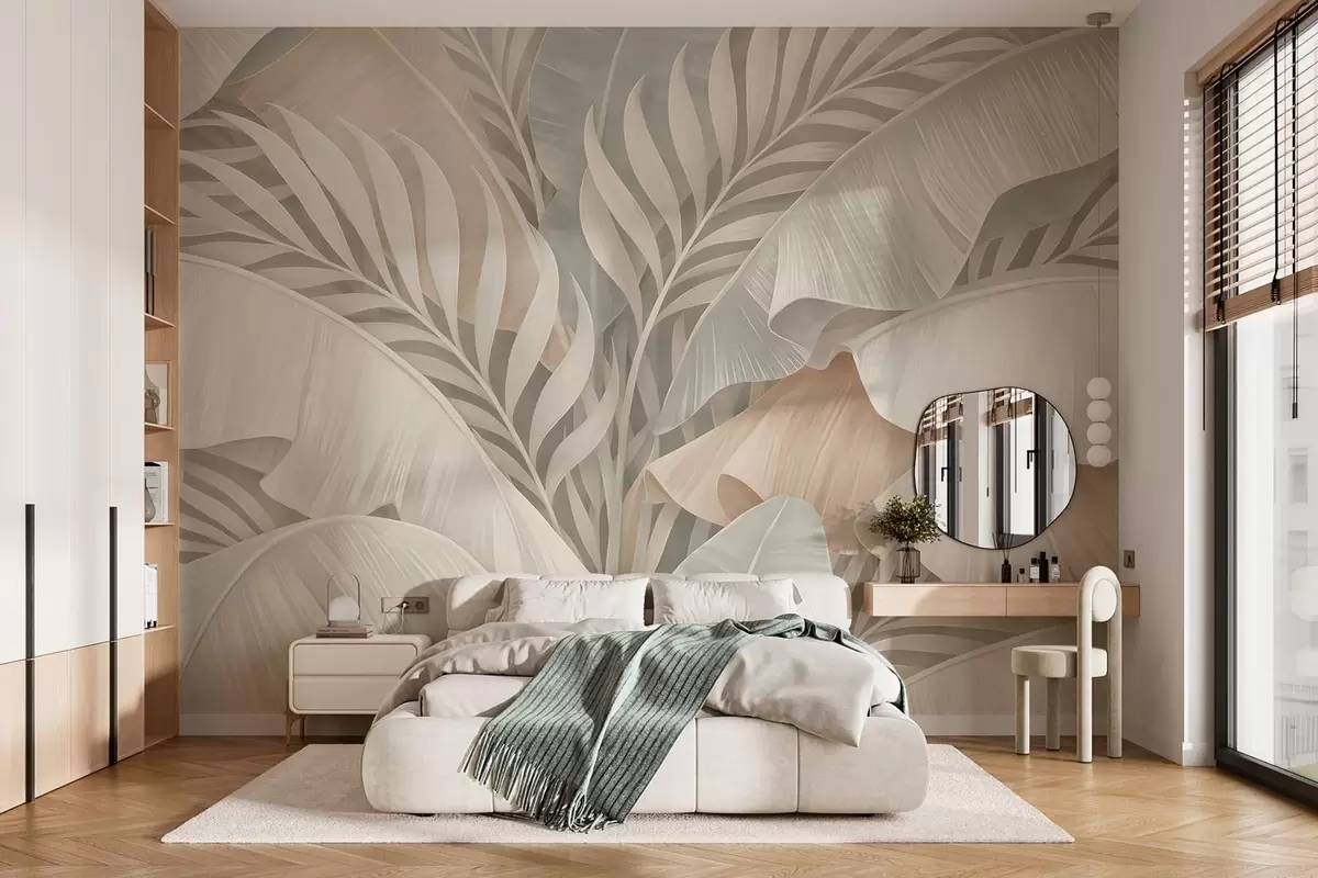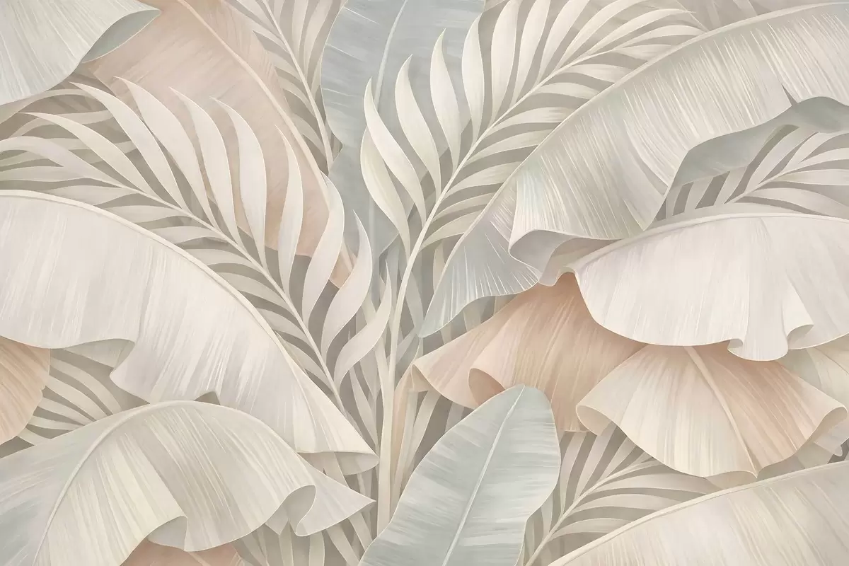 Papel tapiz Grandes hojas tropicales en tonos melocotón y turquesa apagado. Nr. w05062