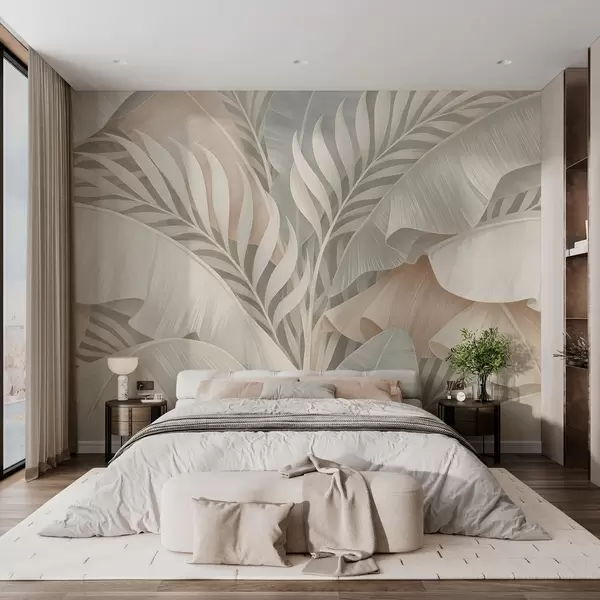 Papel tapiz Grandes hojas tropicales en tonos melocotón y turquesa apagado. Nr. w05062