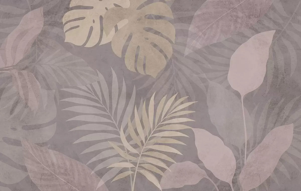 Papel tapiz Hojas tropicales con textura sobre fondo gris. Nr. w05063v1