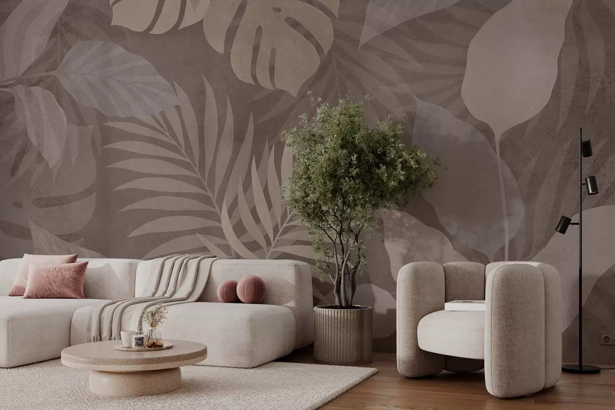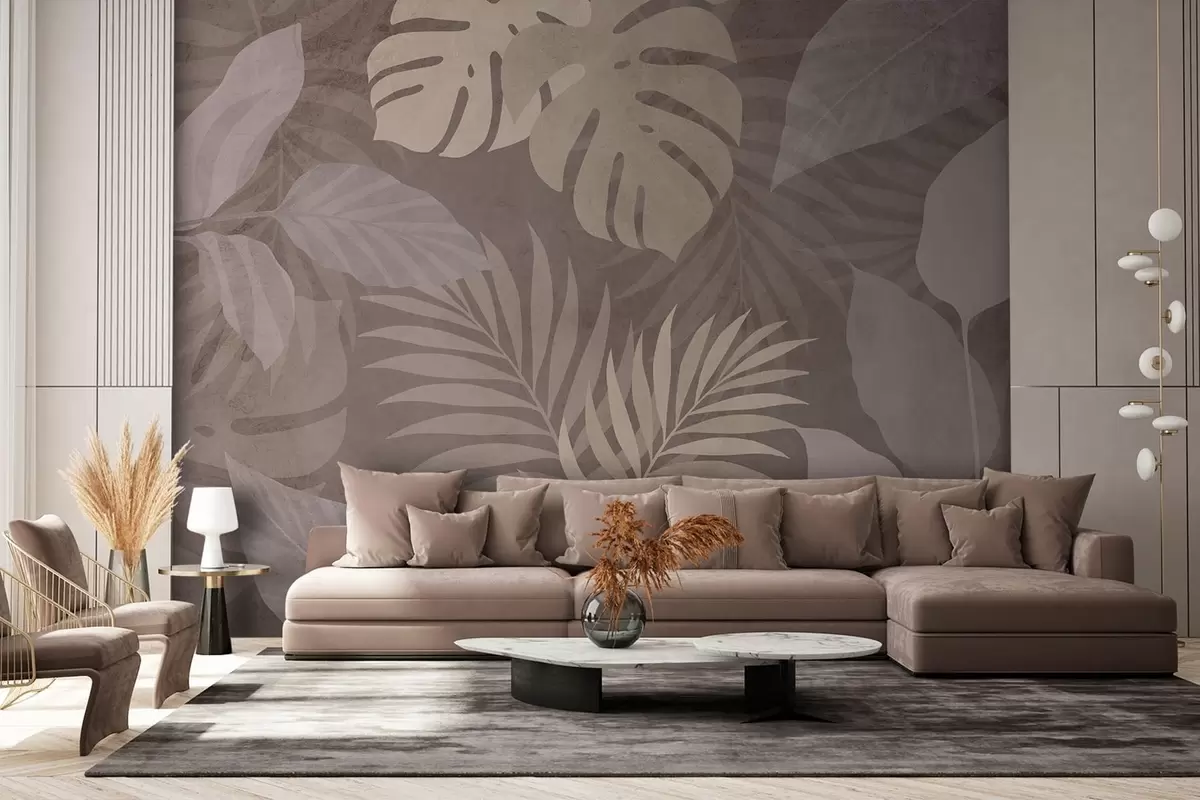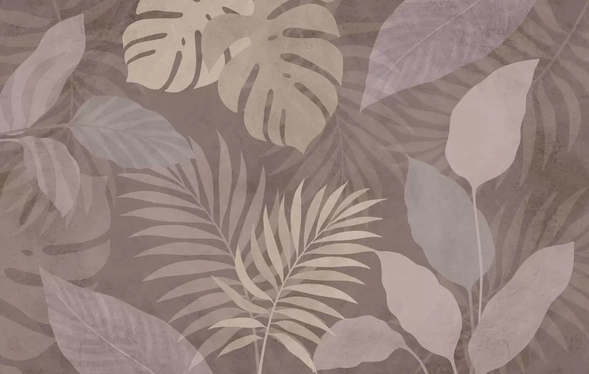 Papel tapiz hojas tropicales texturizadas sobre fondo chocolate Nr. w05063v2