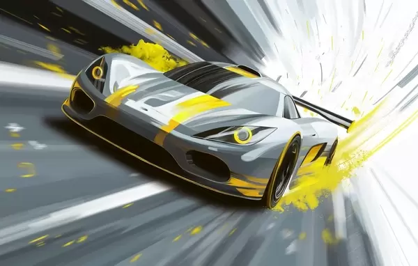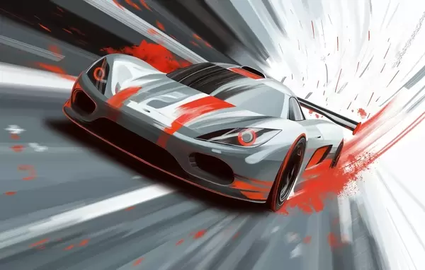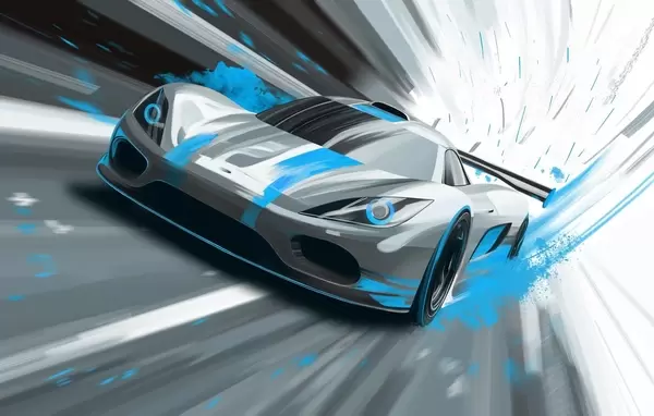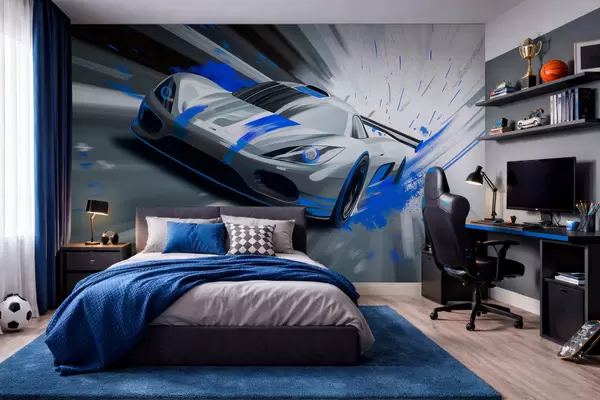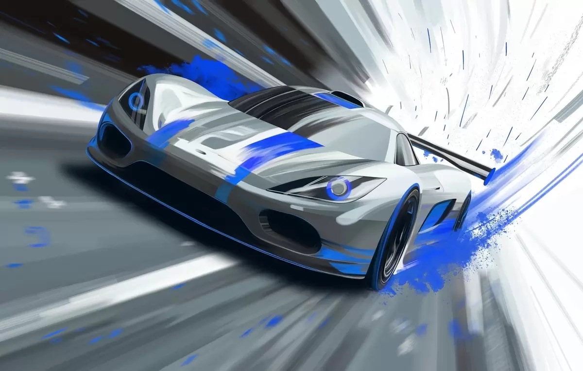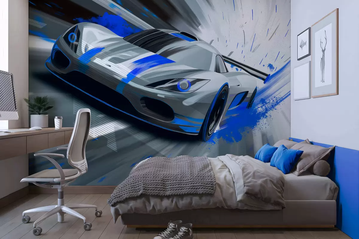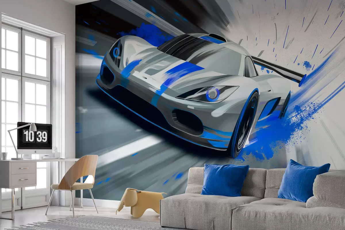 Papel tapiz Coche deportivo dinámico en estilo de dibujo digital con detalles en azul. Nr. w05069