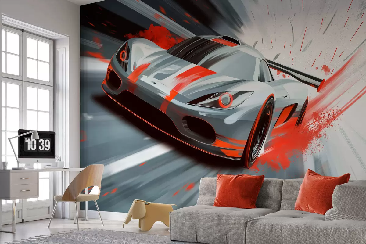 Papel tapiz Coche deportivo dinámico en estilo de dibujo digital con detalles en rojo. Nr. w05069v1