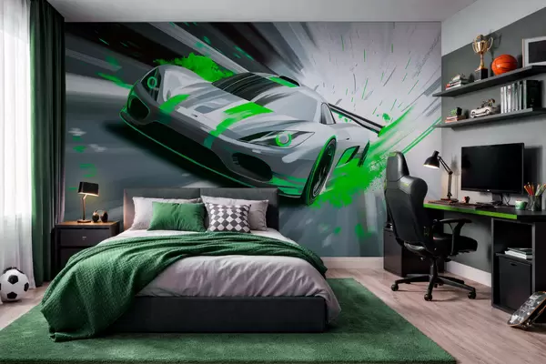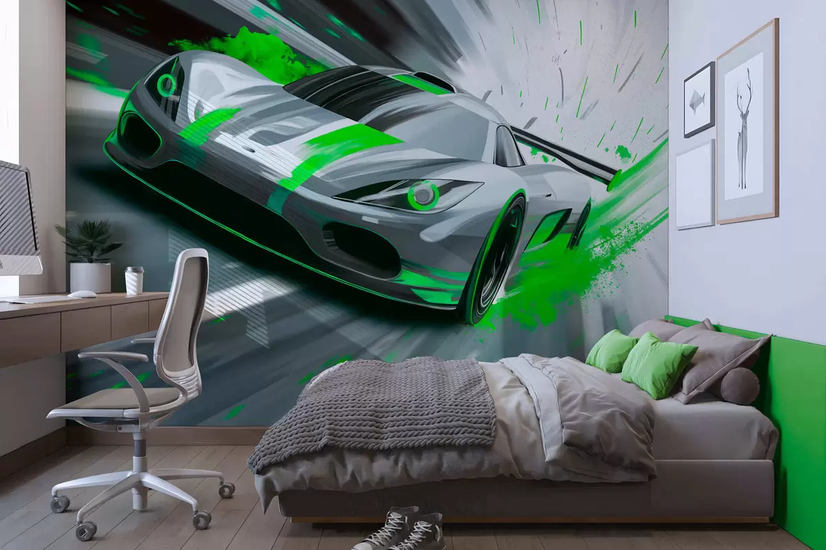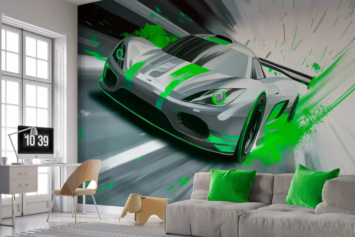 Papel tapiz Coche deportivo dinámico con estilo de dibujo digital y detalles en verde. Nr. w05069v4