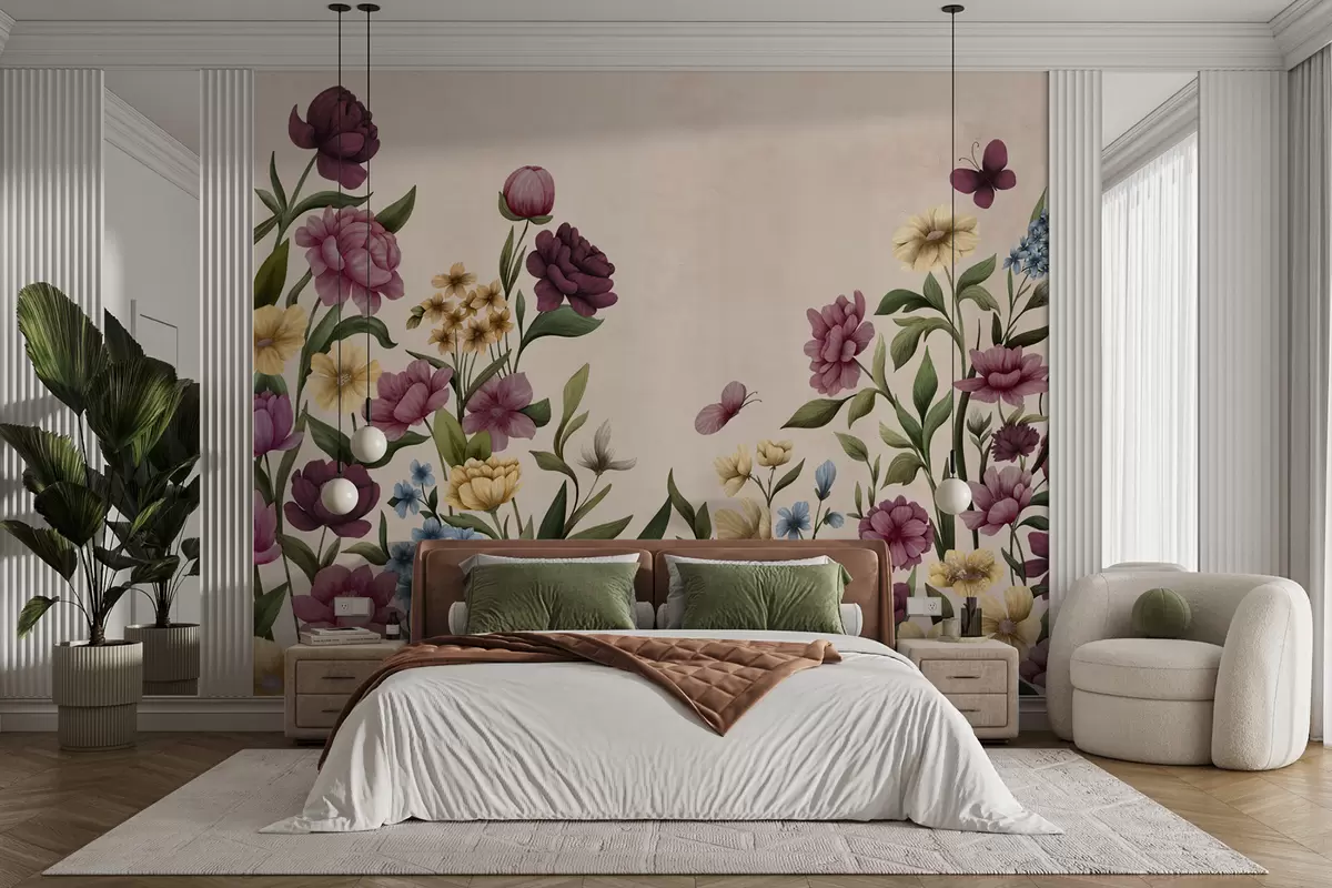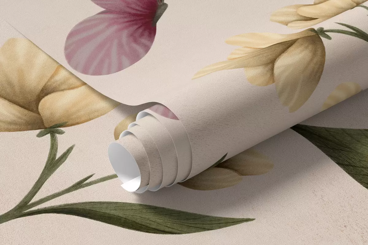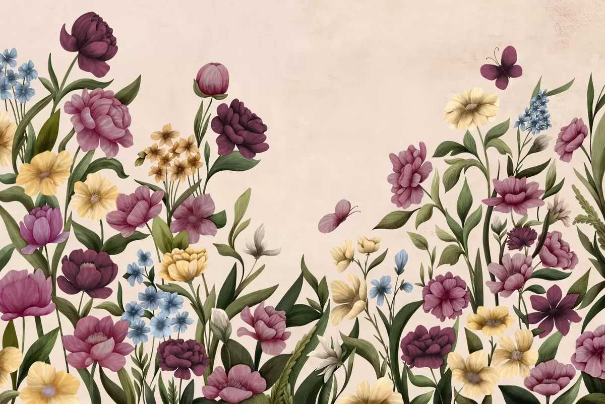 Papel tapiz Composición floral con plantas y mariposas sobre fondo claro. Nr. w05072