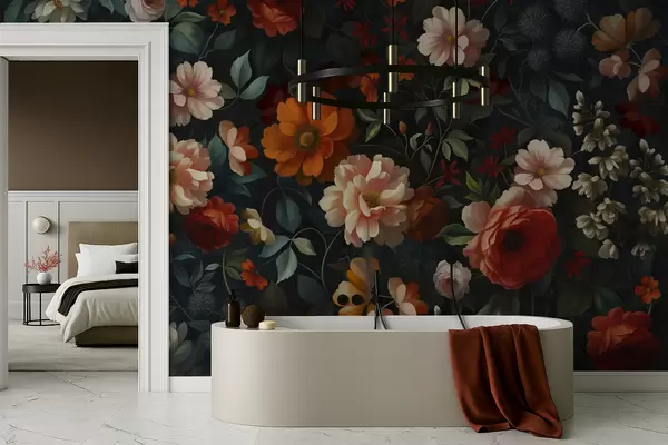 Papel tapiz Estampado floral oscuro con exuberantes flores de jardín. Nr. w05087