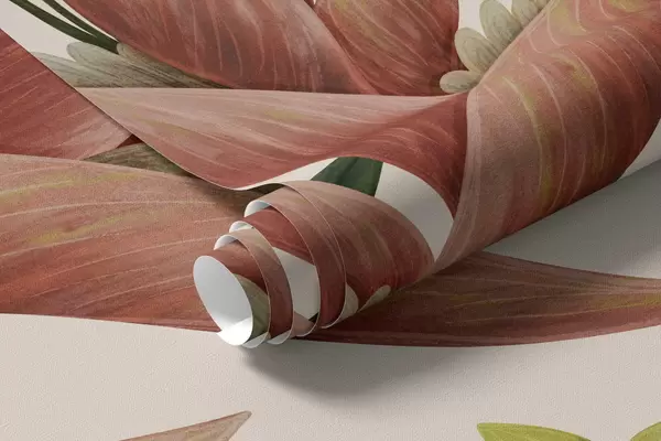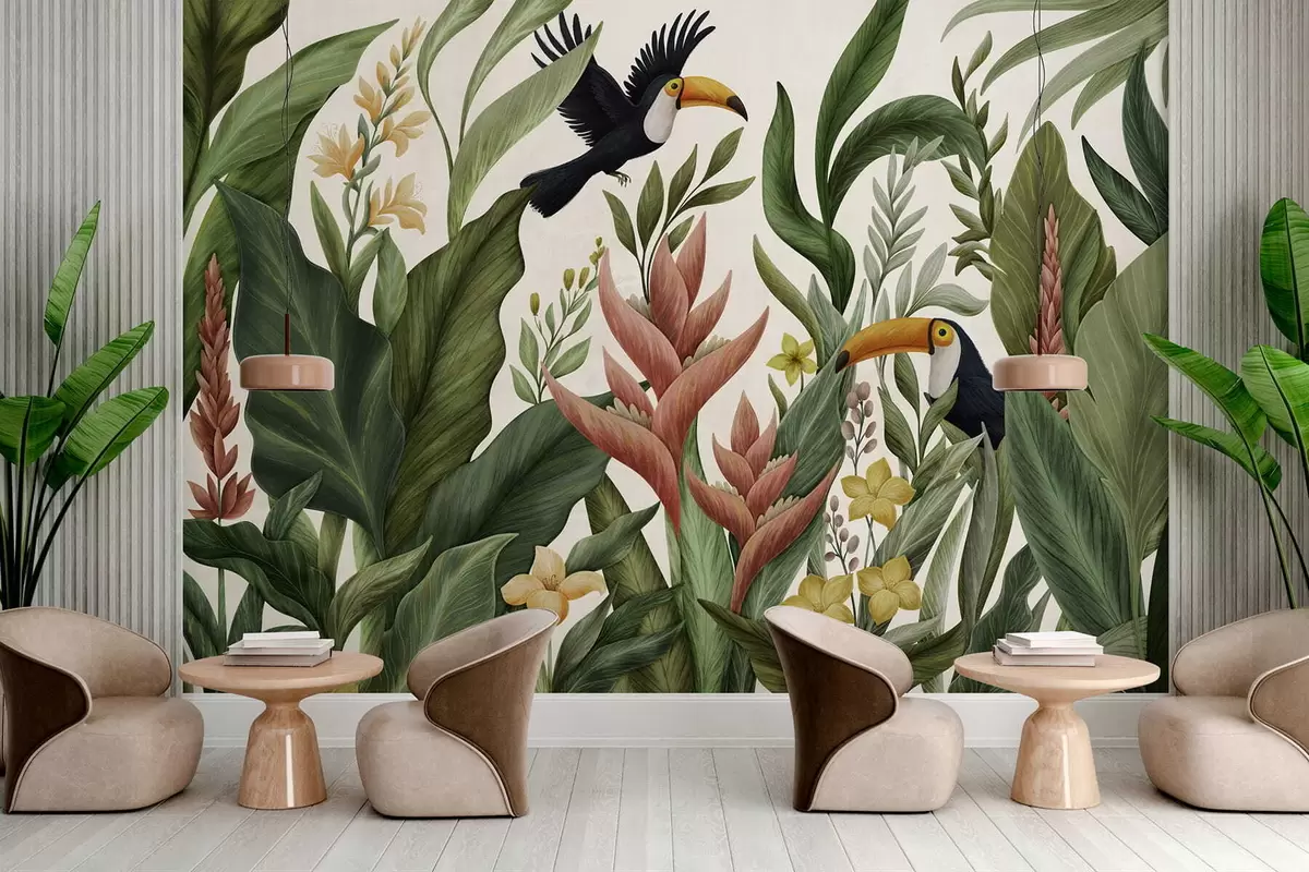 Papel tapiz Plantas tropicales y aves de pico grande sobre fondo claro Nr. w05088v1