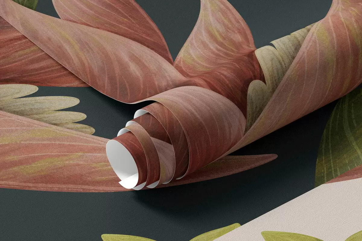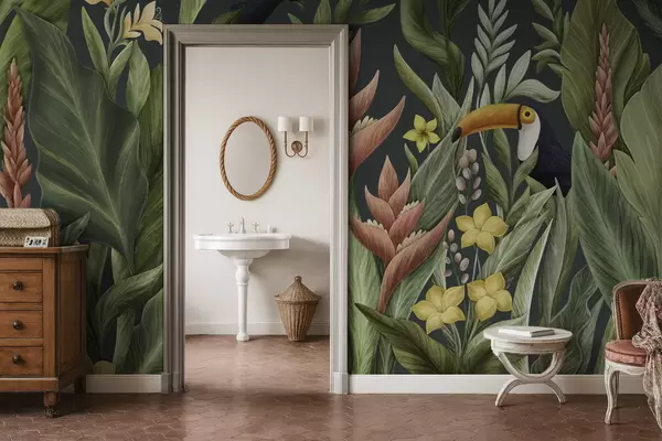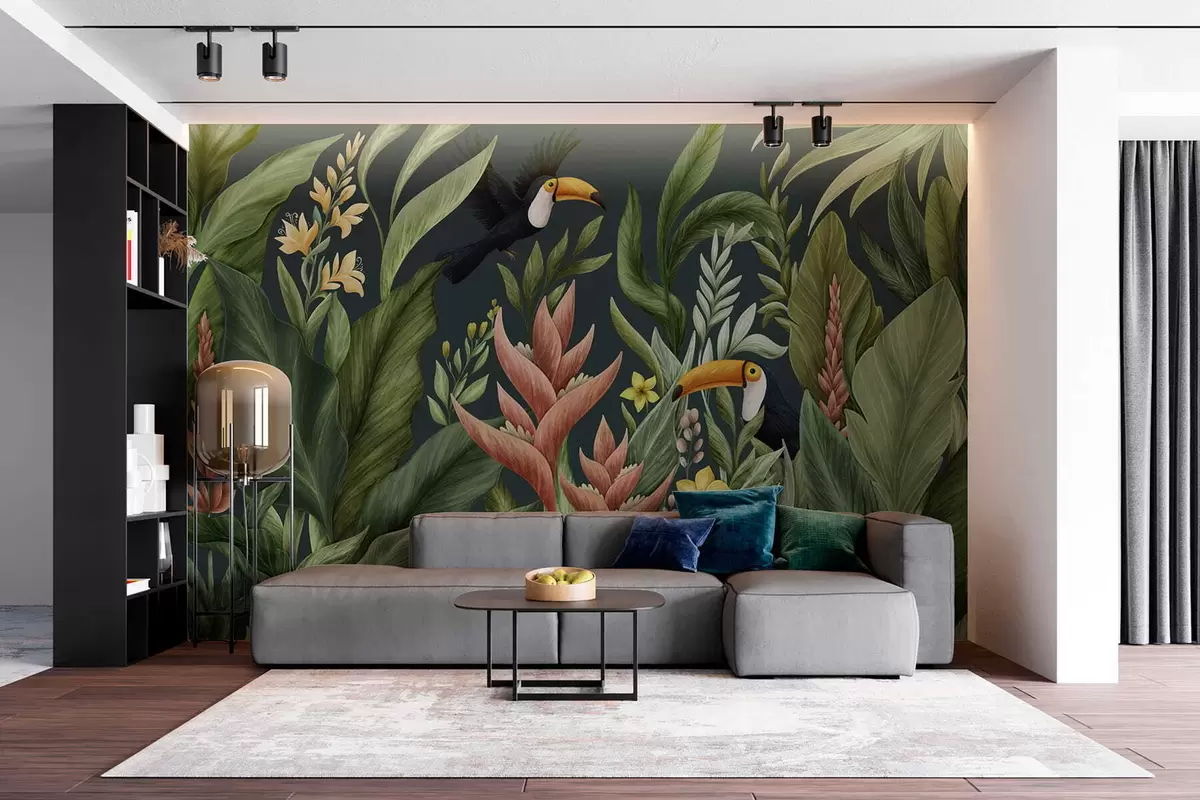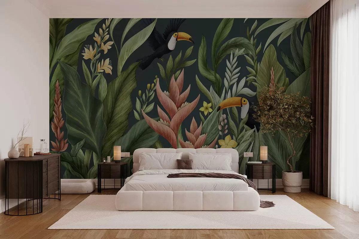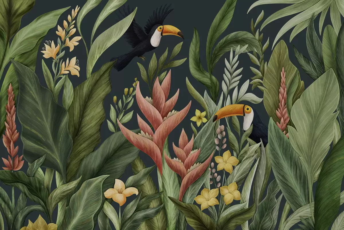 Papel tapiz Plantas tropicales y aves de pico grande sobre fondo oscuro Nr. w05088v2
