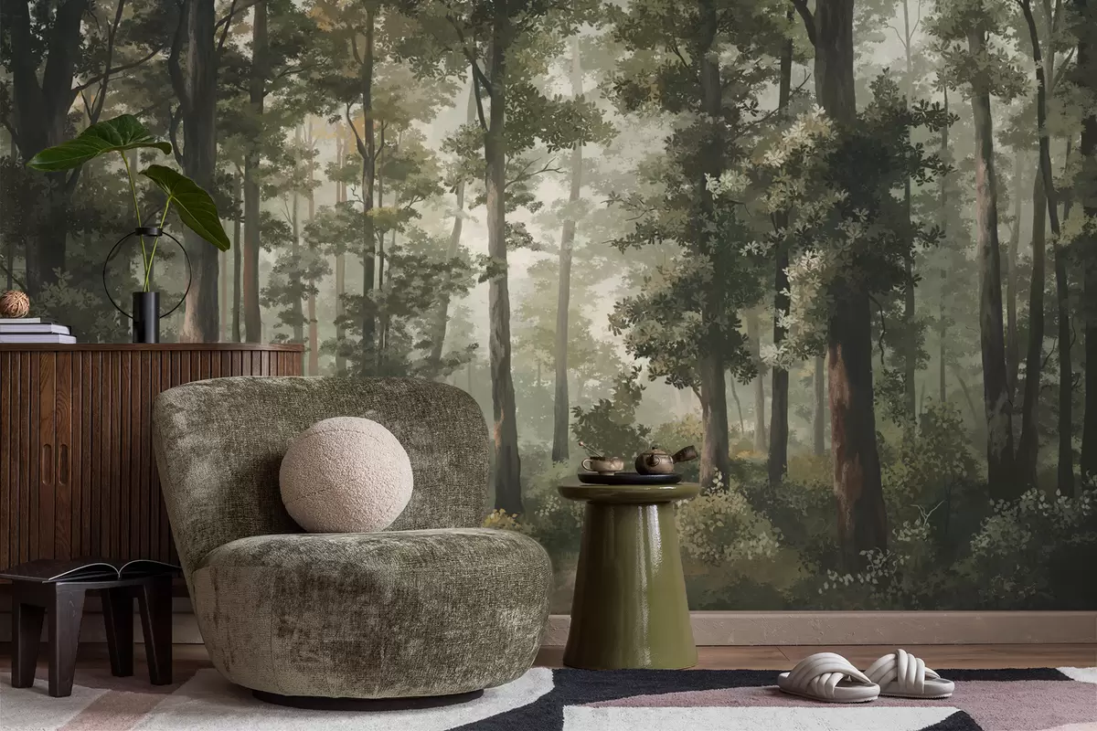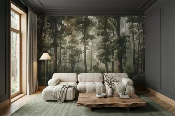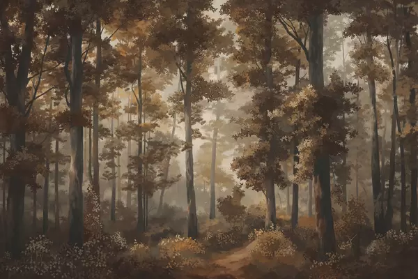 Papel tapiz Ilustración de un bosque con niebla, árboles altos y un sendero. Nr. w05089