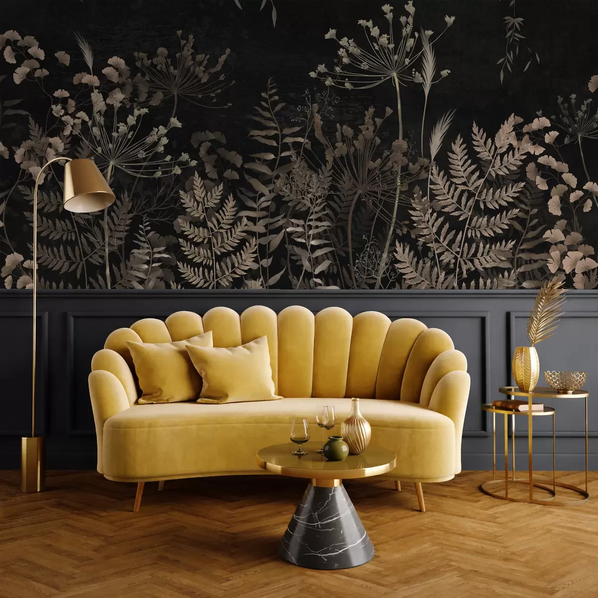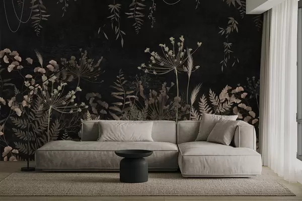 Papel tapiz Diseño botánico oscuro con flores y hojas. Nr. w05092