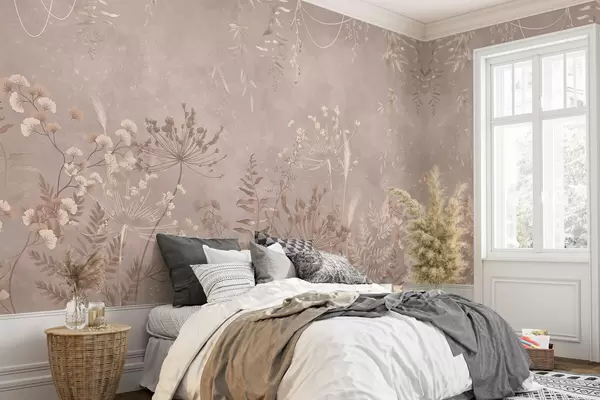 Papel tapiz Motivo botánico en beige suave con flores silvestres. Nr. w05092v2