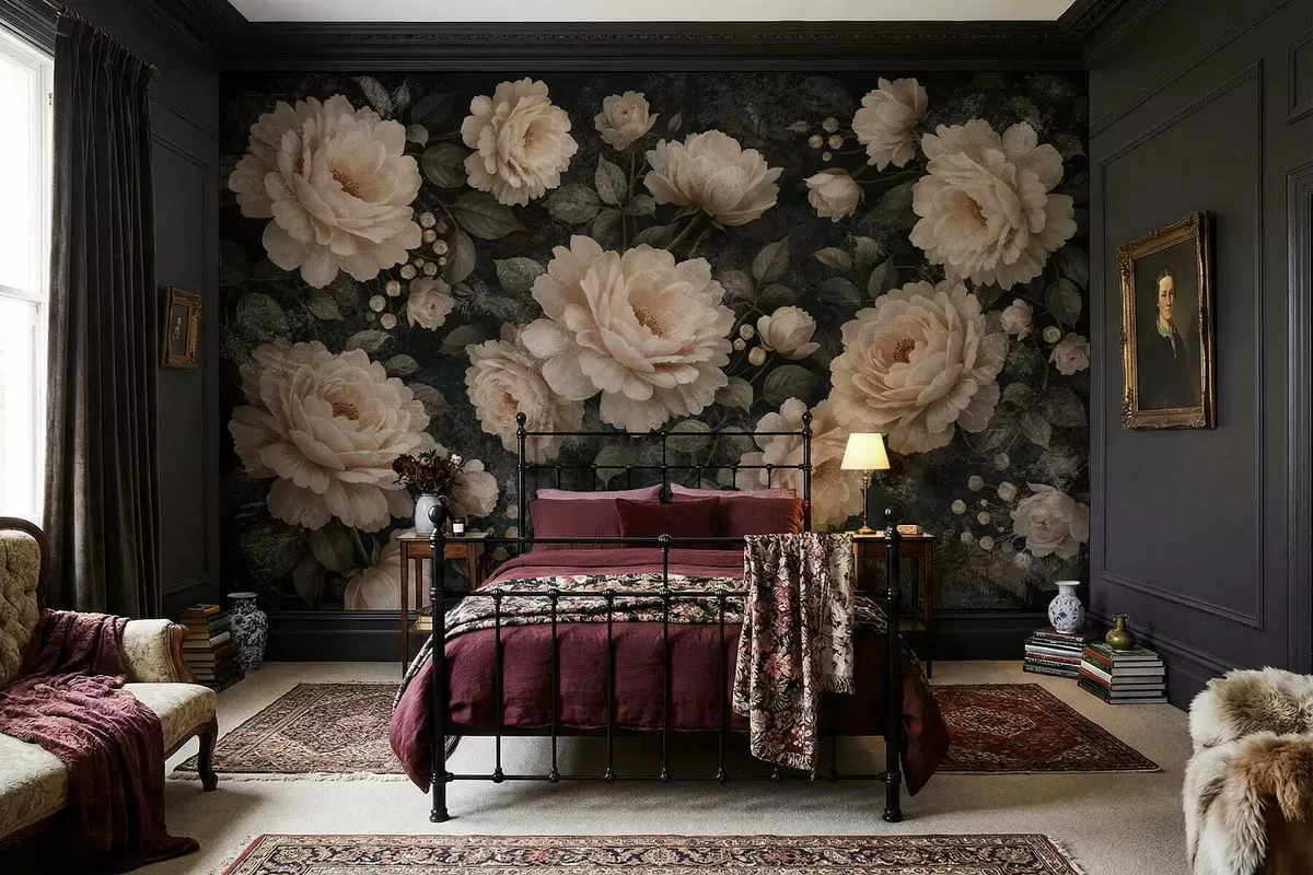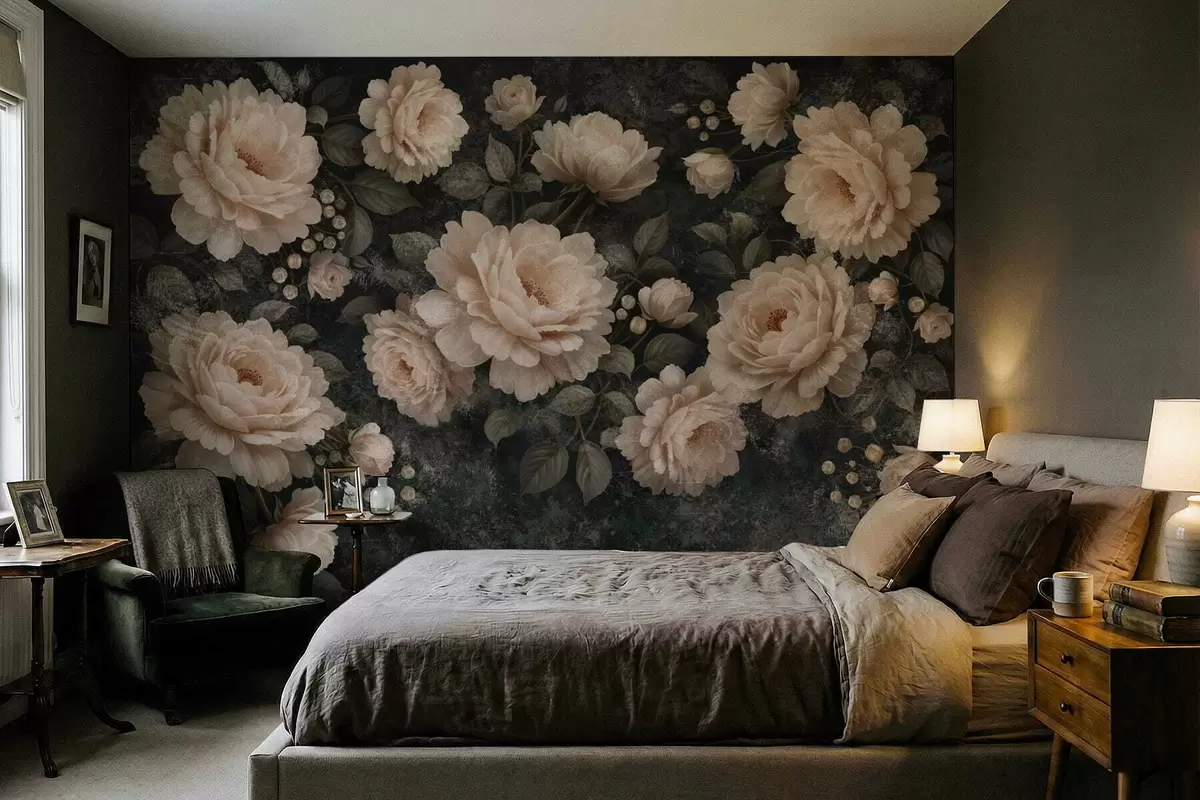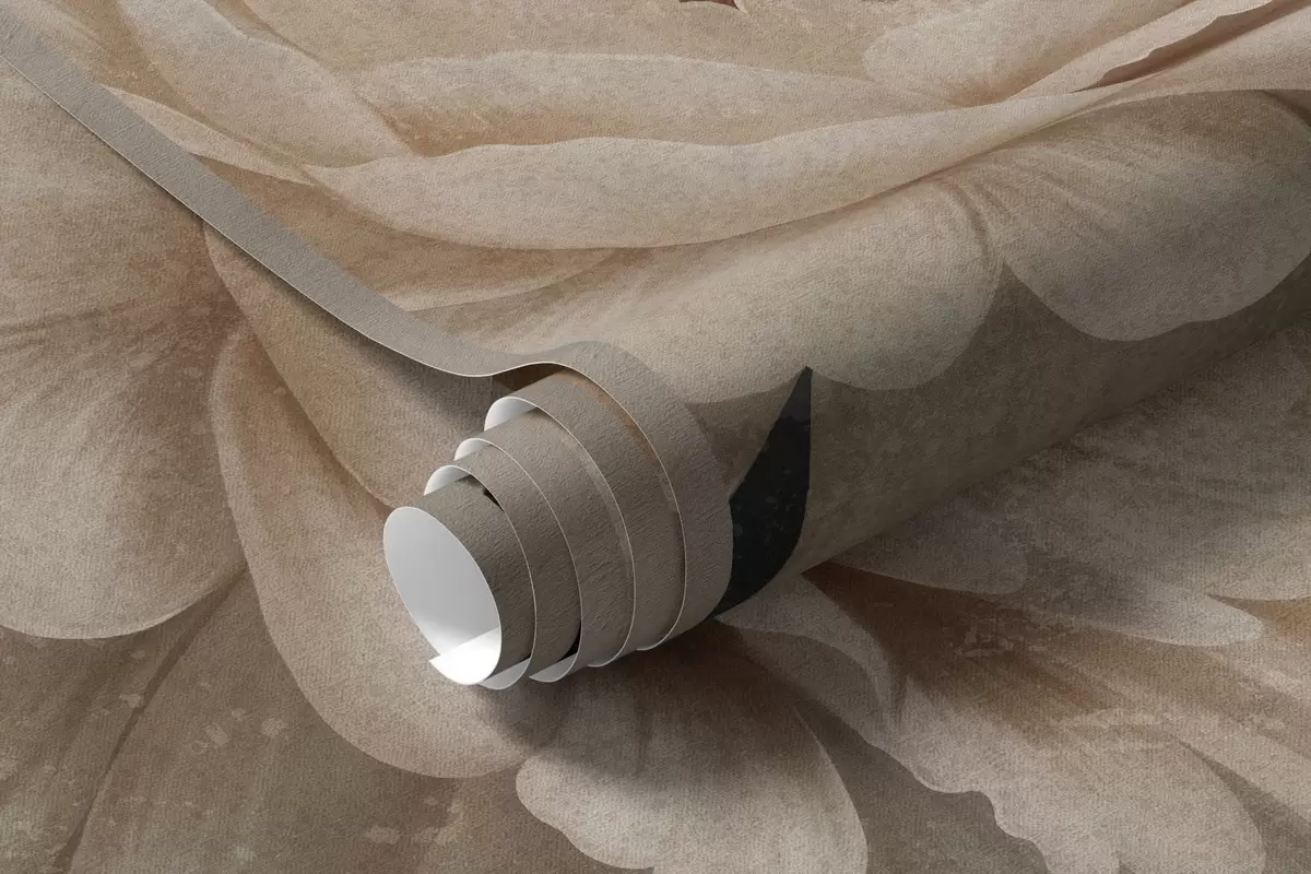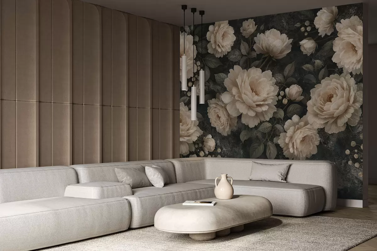 Papel tapiz Flores voluminosas en tonos beige sobre fondo oscuro. Nr. w05114