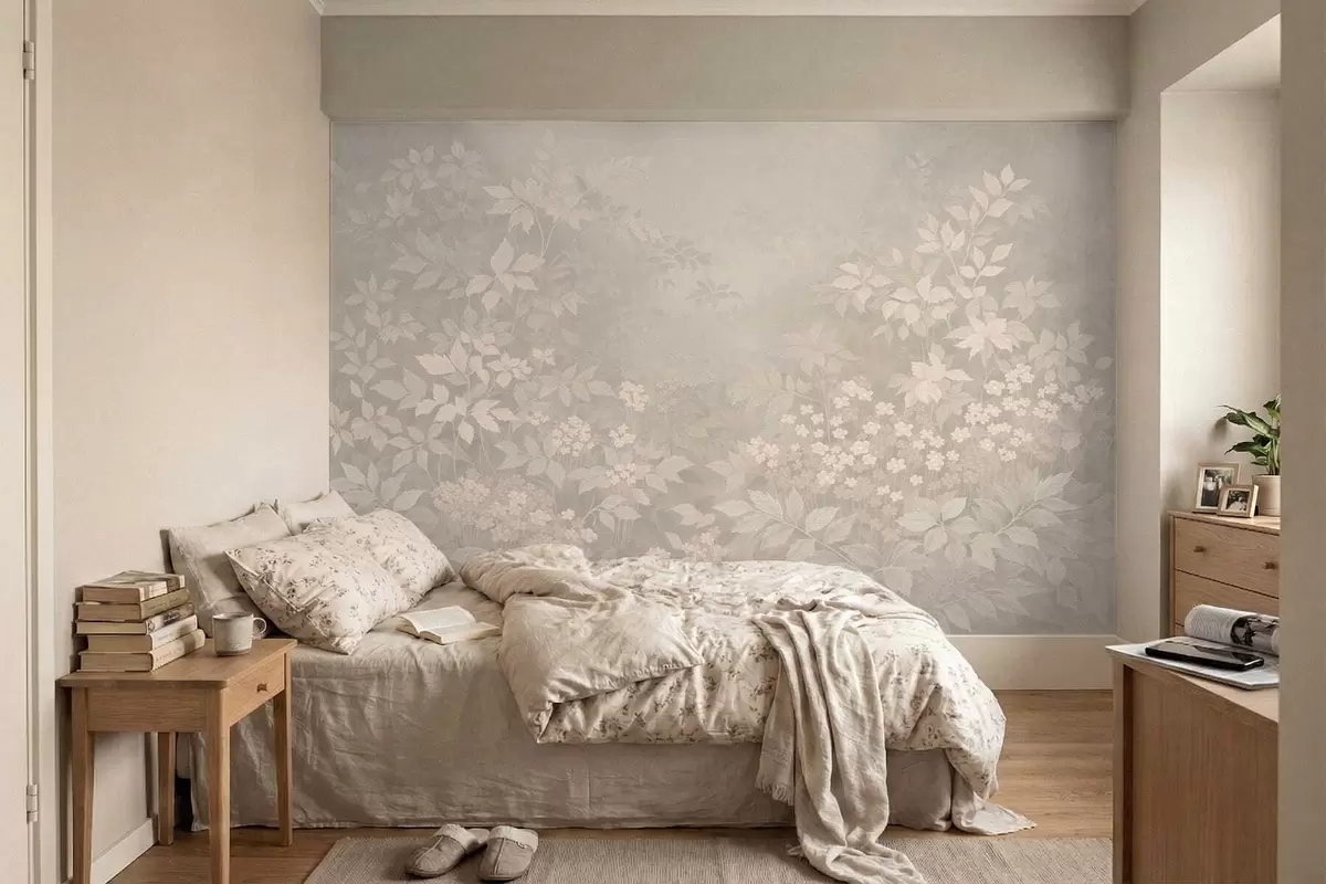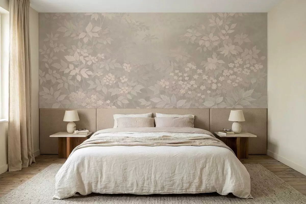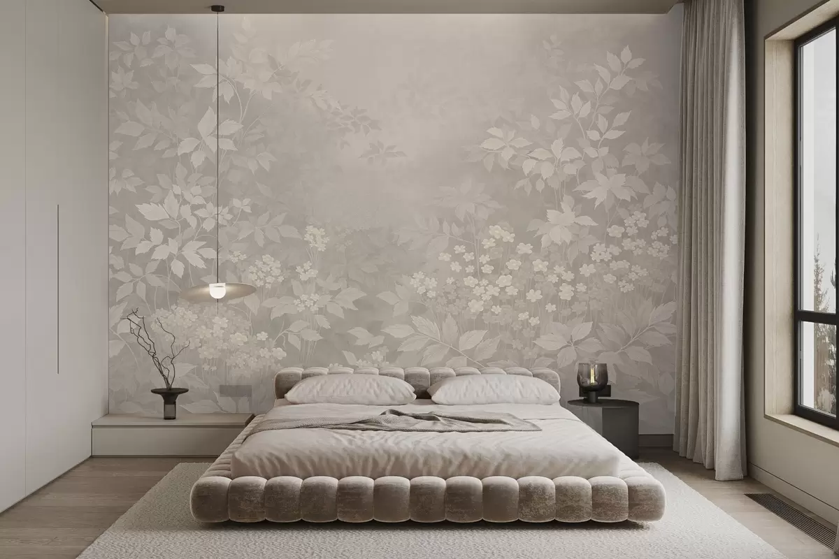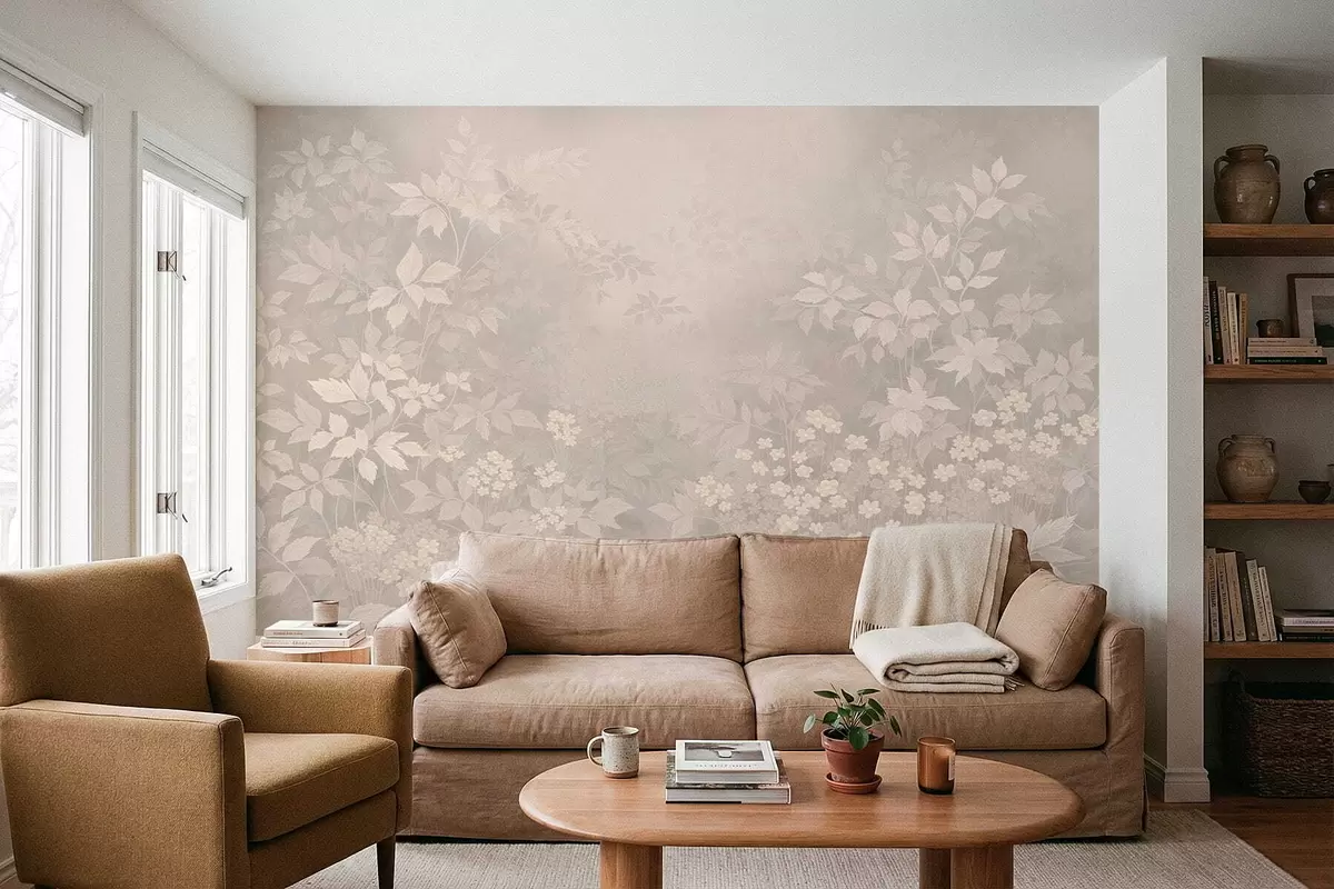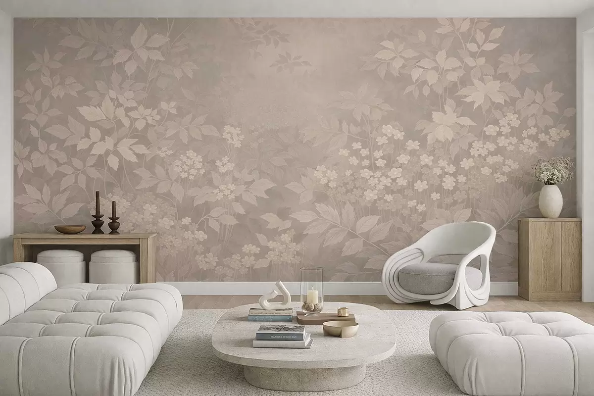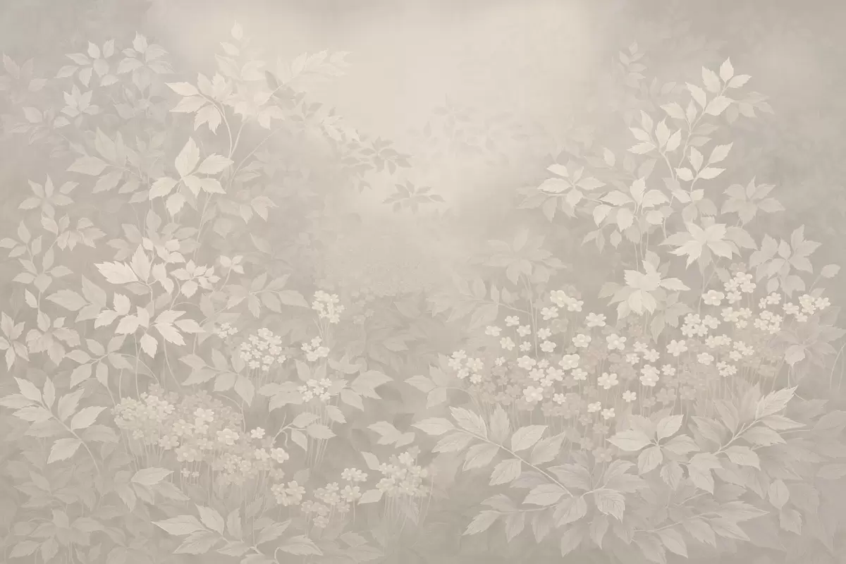 Papel tapiz Suave estampado botánico con hojas y flores en la niebla. Nr. w05115v1