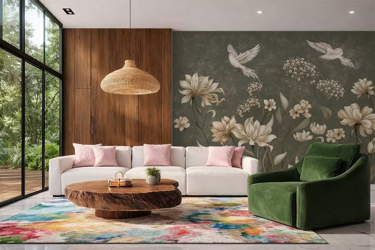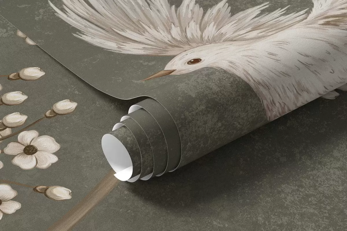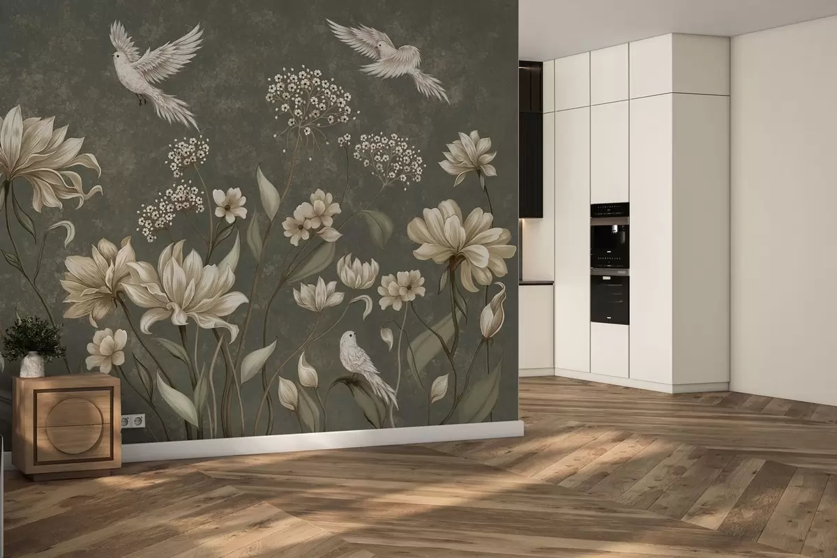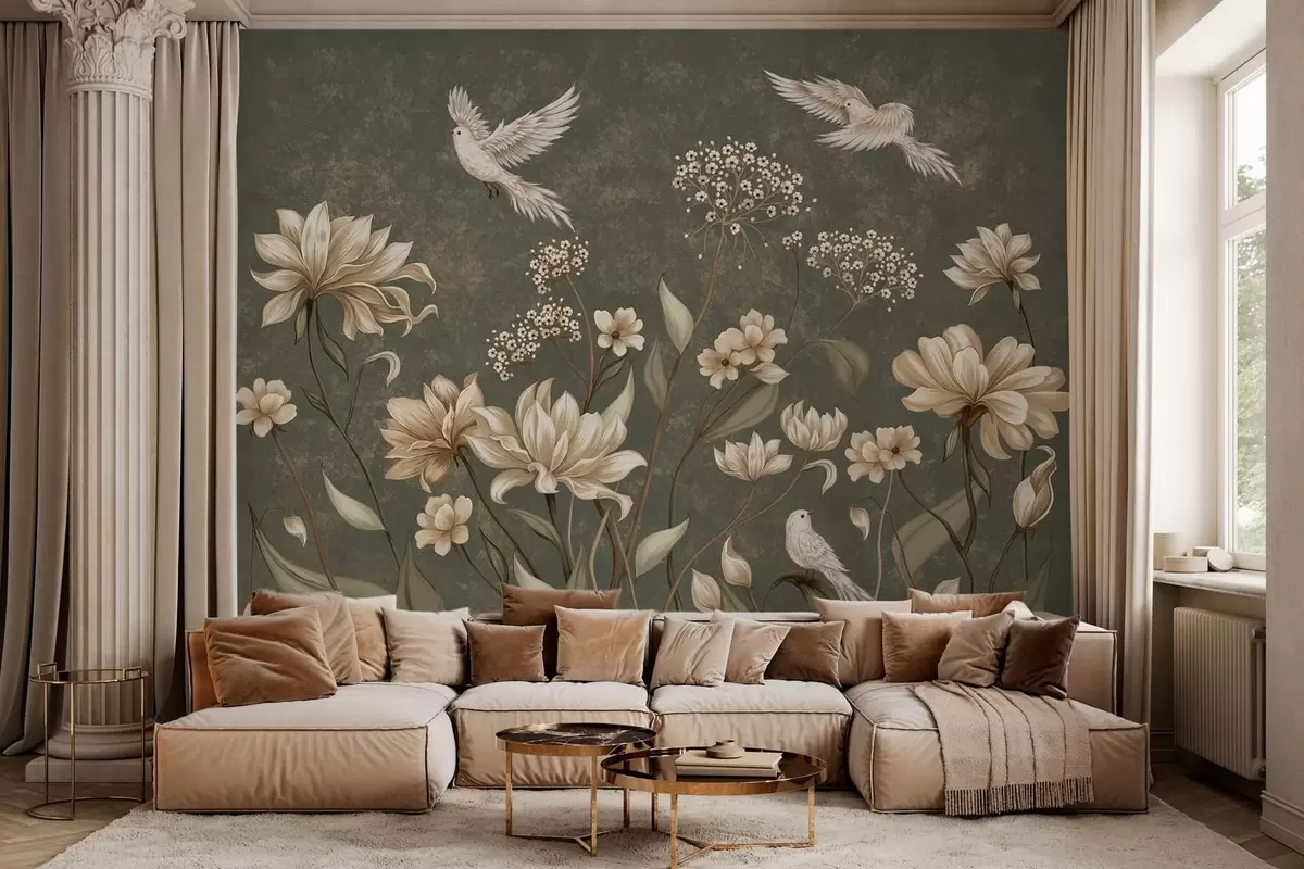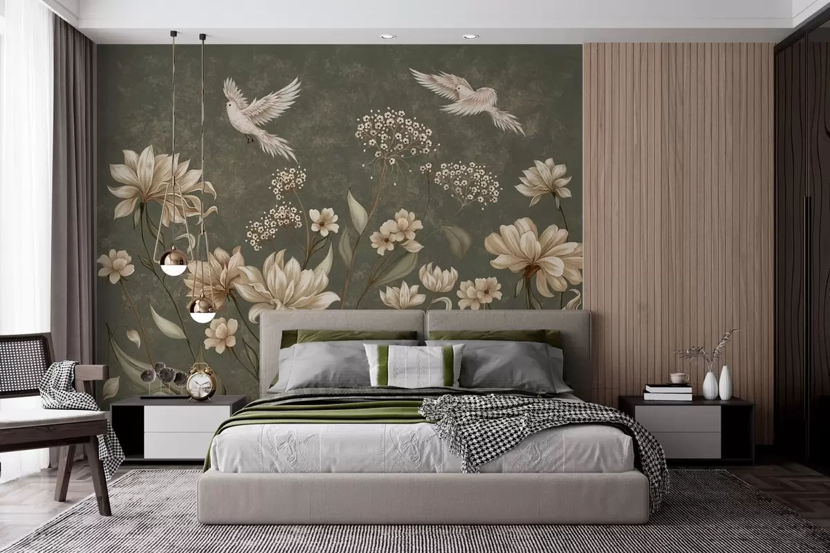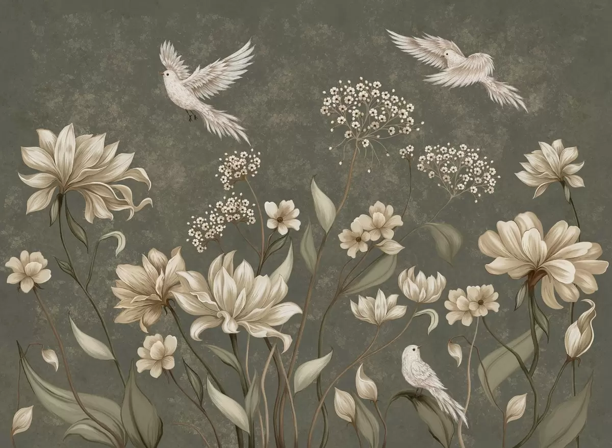 Papel tapiz Flores y pájaros sobre un fondo verde oscuro Nr. w05118v3