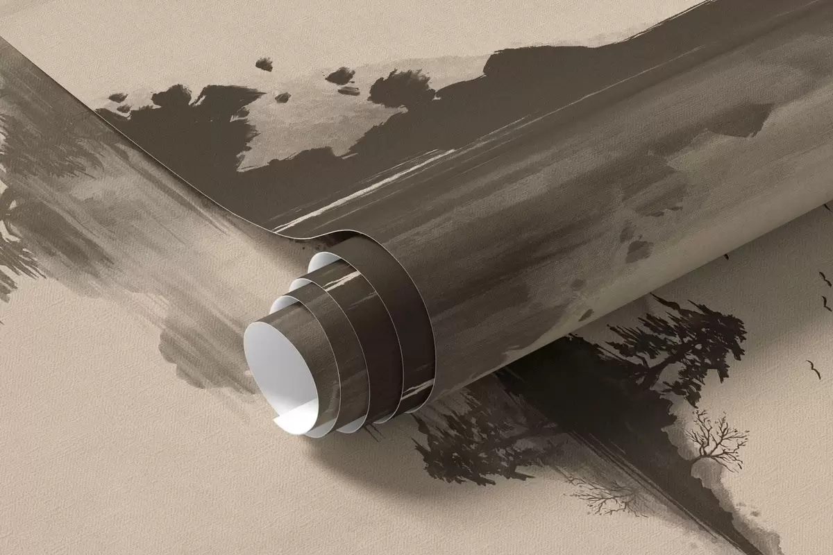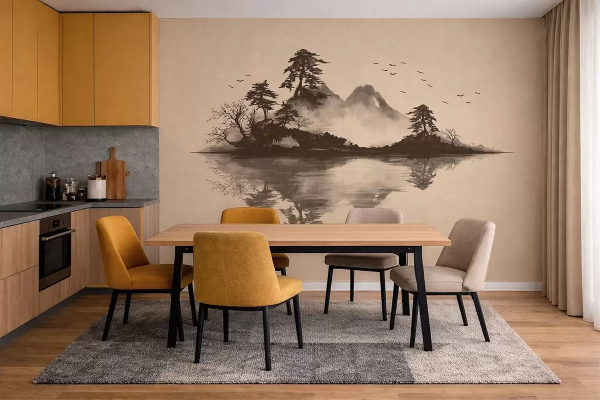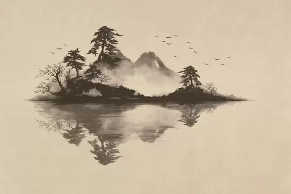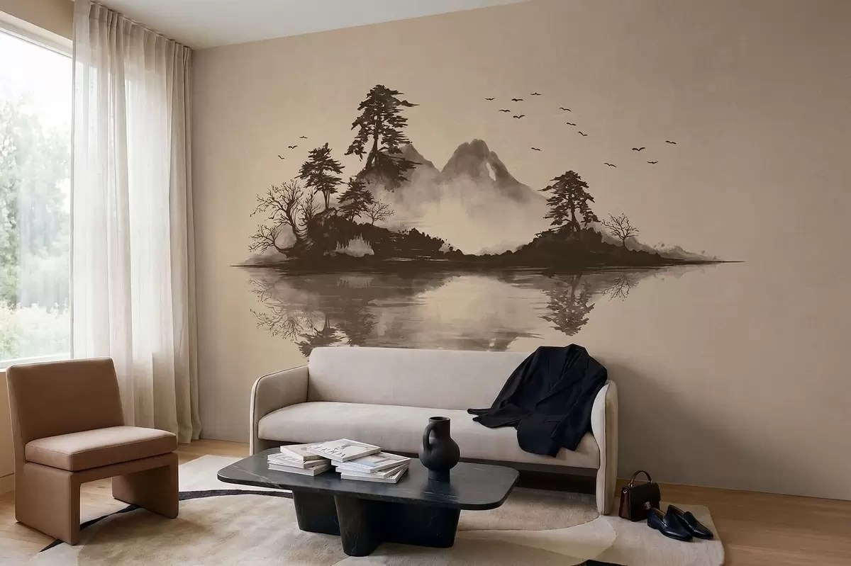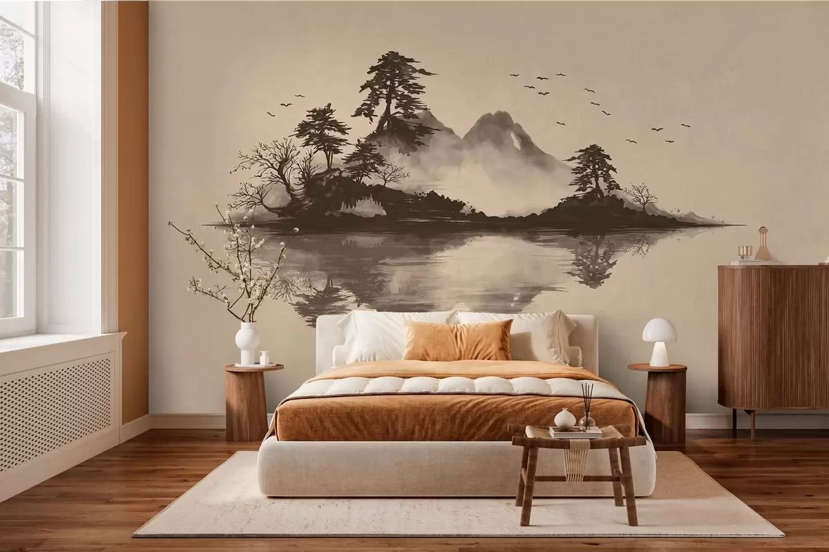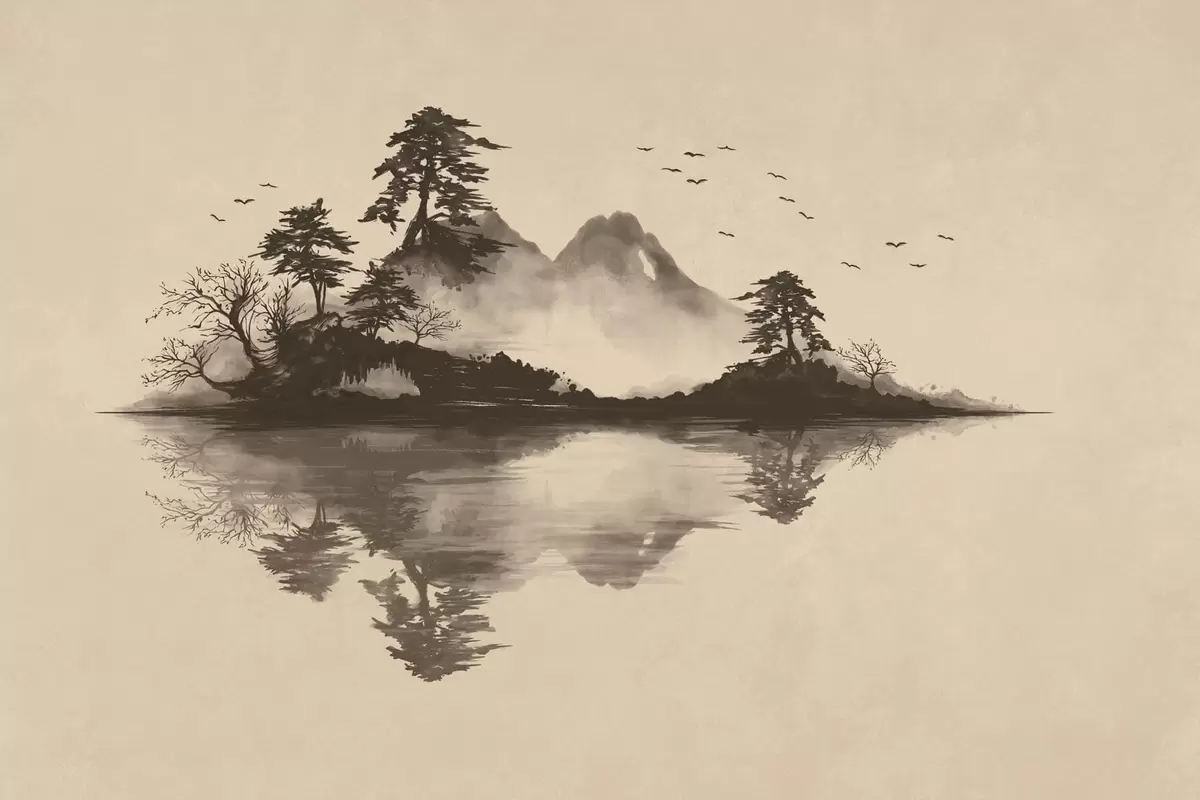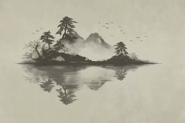 Papel tapiz Paisaje montañoso en estilo sumi-e con pinos y reflejos Nr. w05124