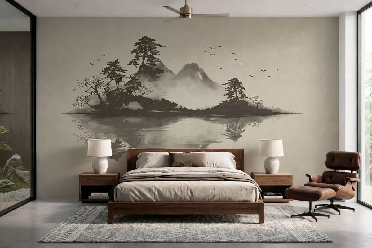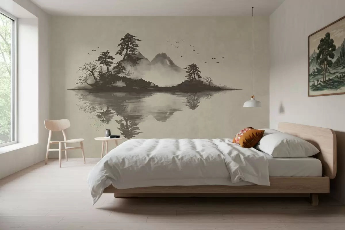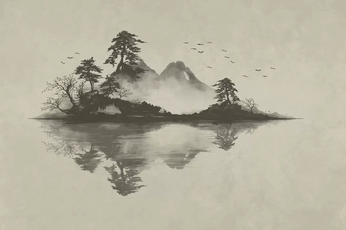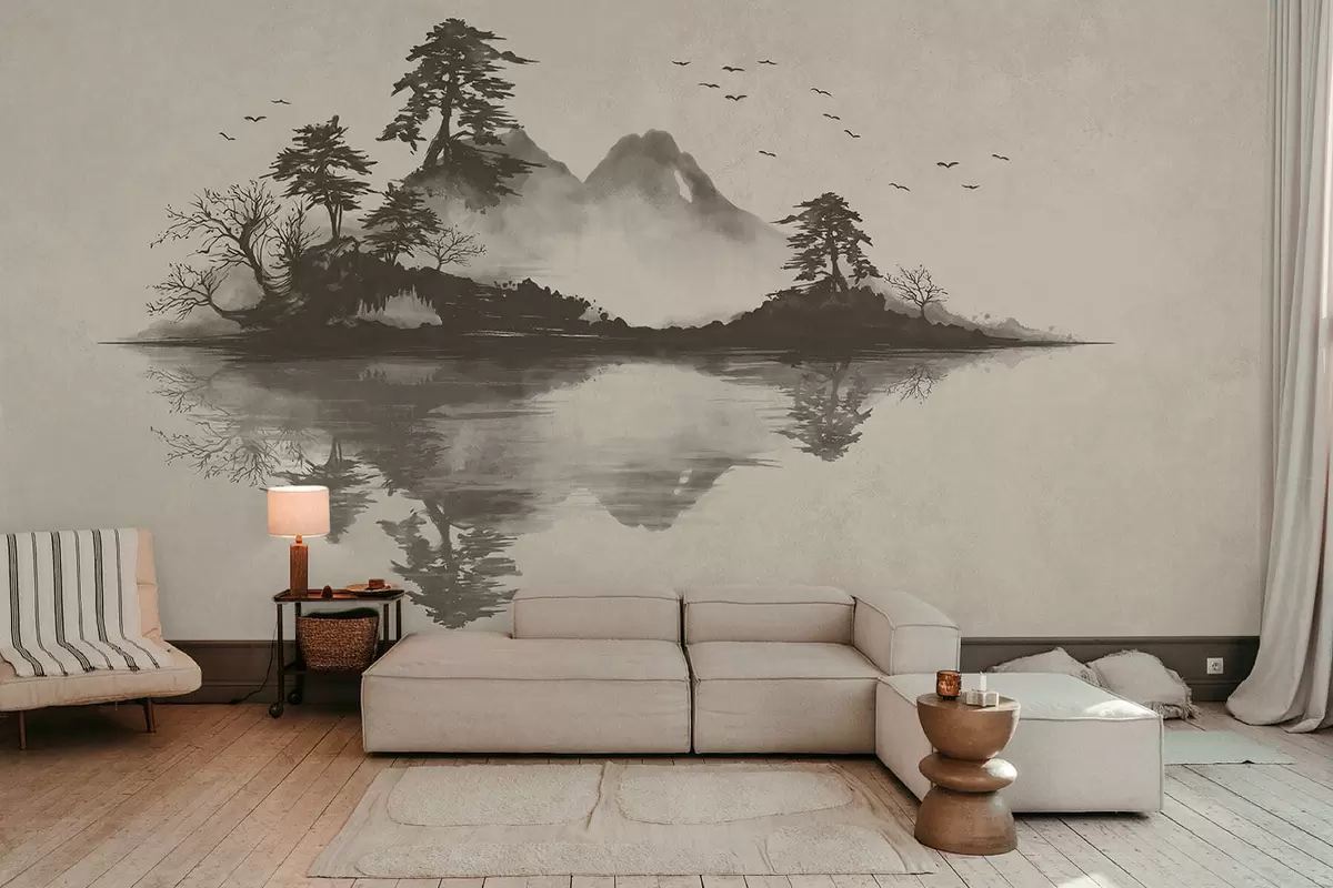 Papel tapiz Paisaje montañoso en estilo sumi-e en suaves tonos grises Nr. w05124v1