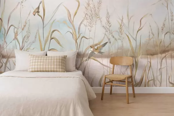 Papel tapiz Ilustración de juncos y pájaros junto al agua en tonos suaves. Nr. w05125