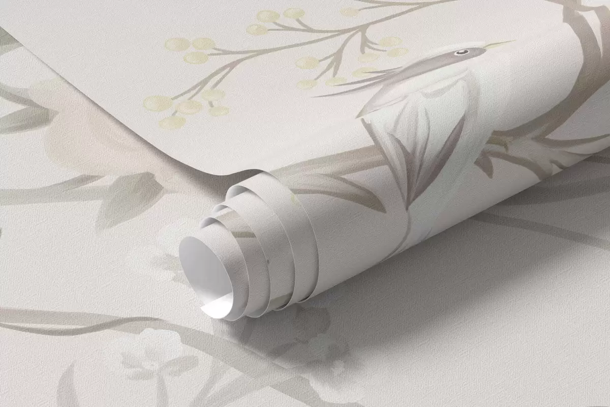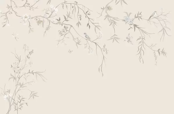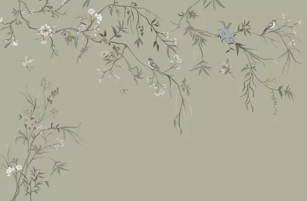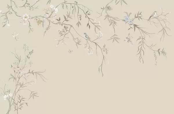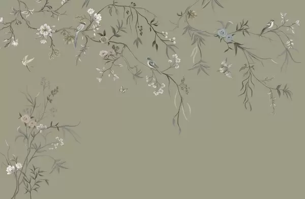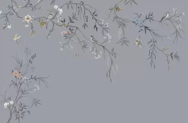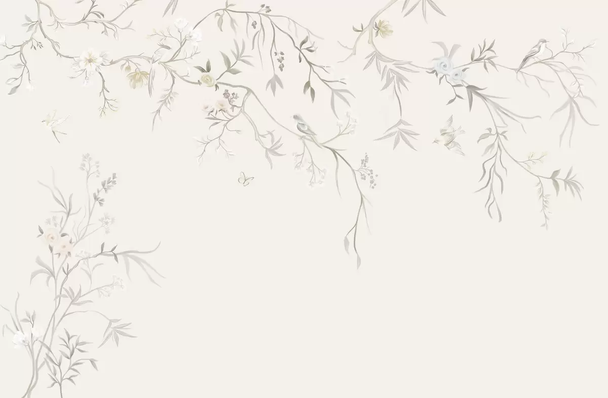 Papel tapiz Delicadas flores y pájaros sobre fondo de tiza. Nr. w05127