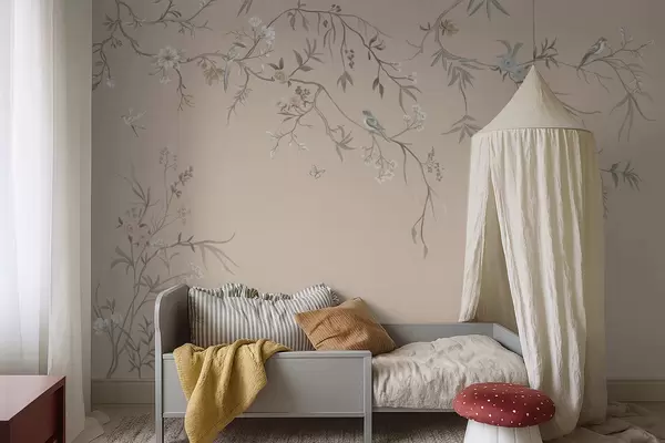 Papel tapiz Ramas florales con pájaros sobre un fondo beige cálido Nr. w05127v1