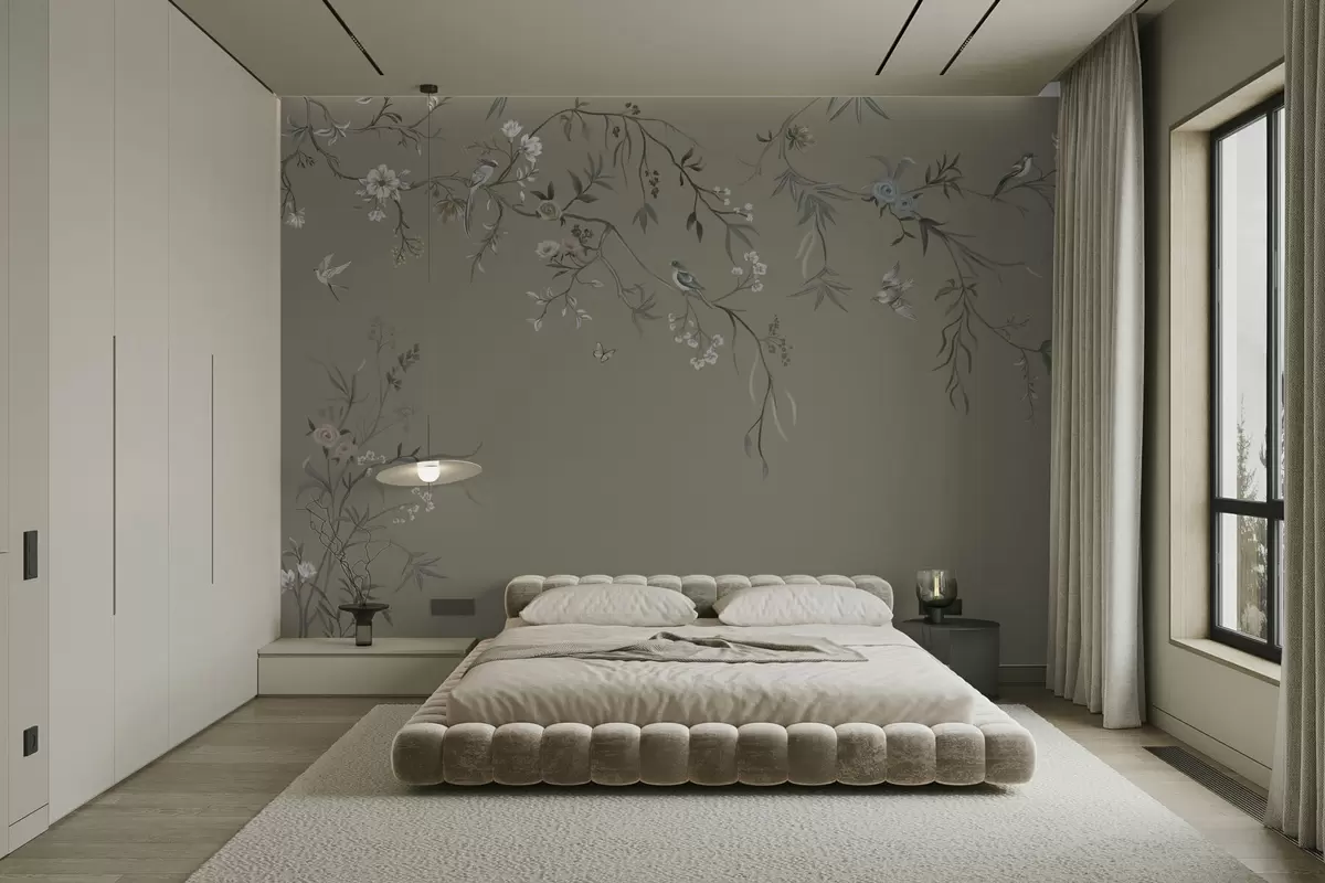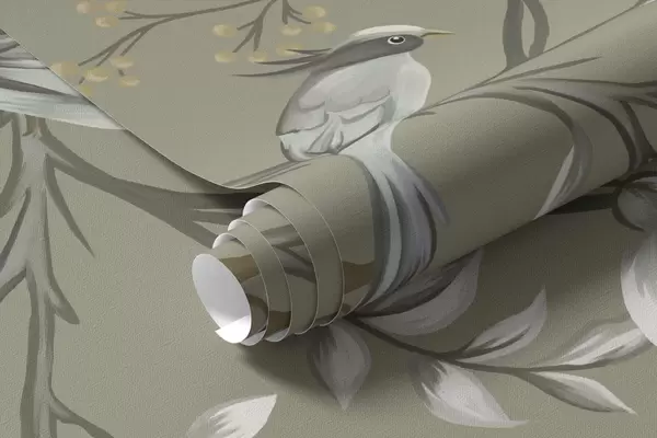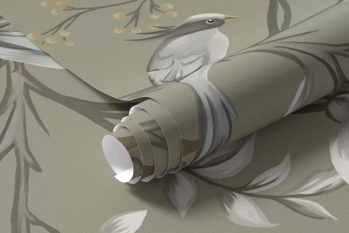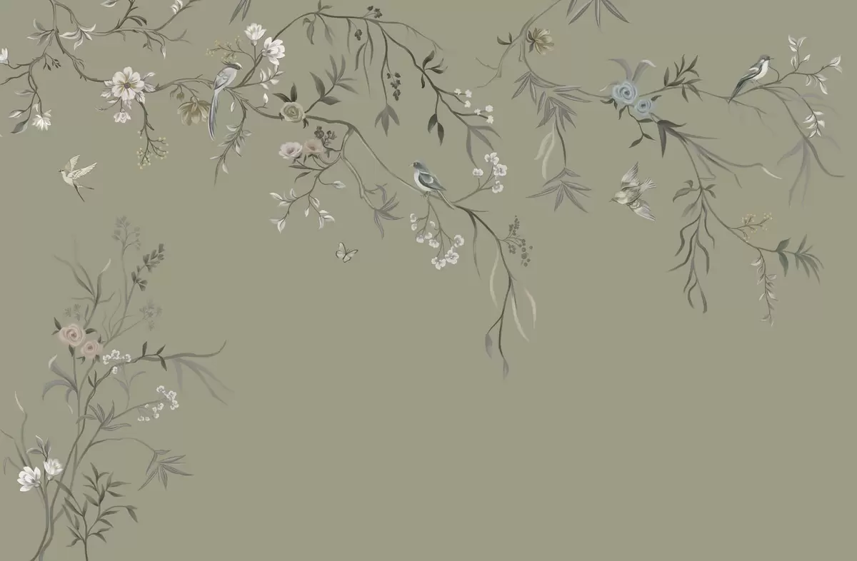 Papel tapiz Motivo floral con pájaros sobre fondo gris Nr. w05127v4