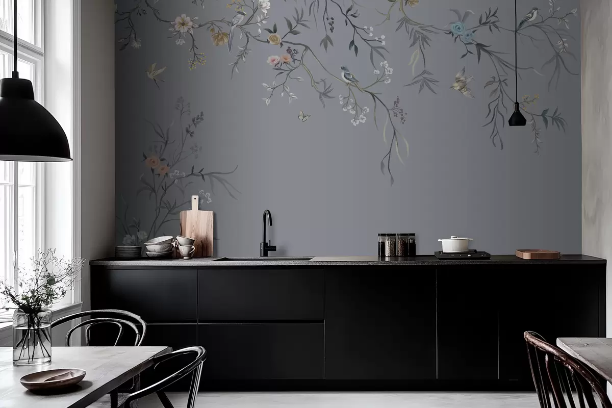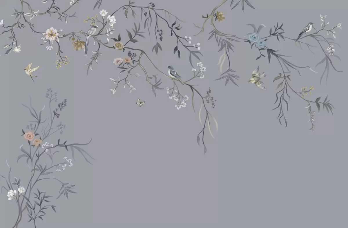 Papel tapiz Ramas florales con pájaros sobre fondo verdoso Nr. w05127v5