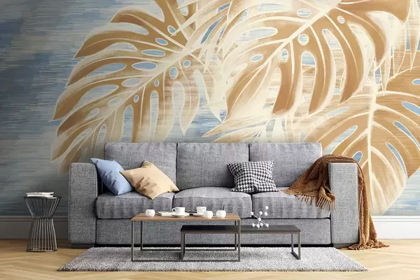 Papel tapiz Hojas en tonos arena claros sobre fondo azul. Nr. w05130v1