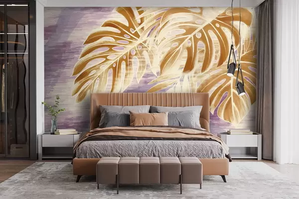 Papel tapiz Hojas en cálidos tonos naranjas sobre fondo morado. Nr. w05130v2