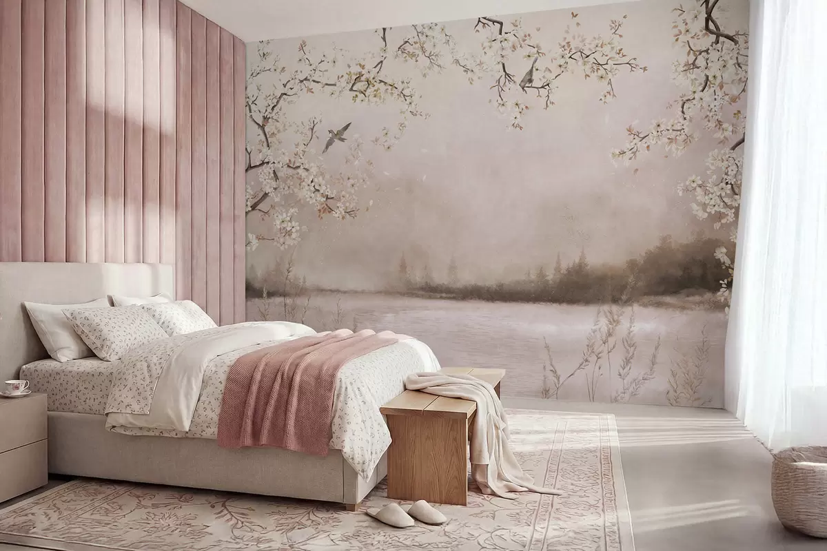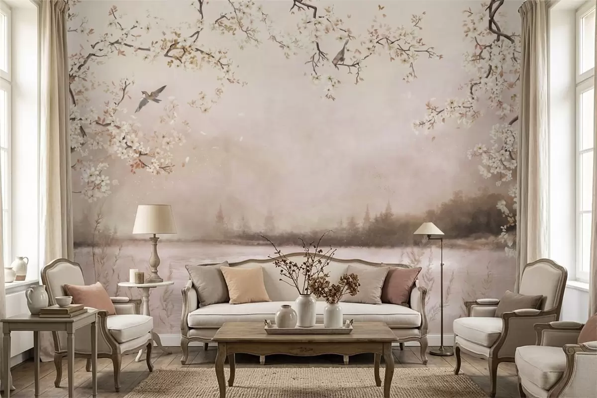 Papel tapiz Ramas en flor sobre un lago tranquilo con pájaros en la niebla. Nr. w05155v1