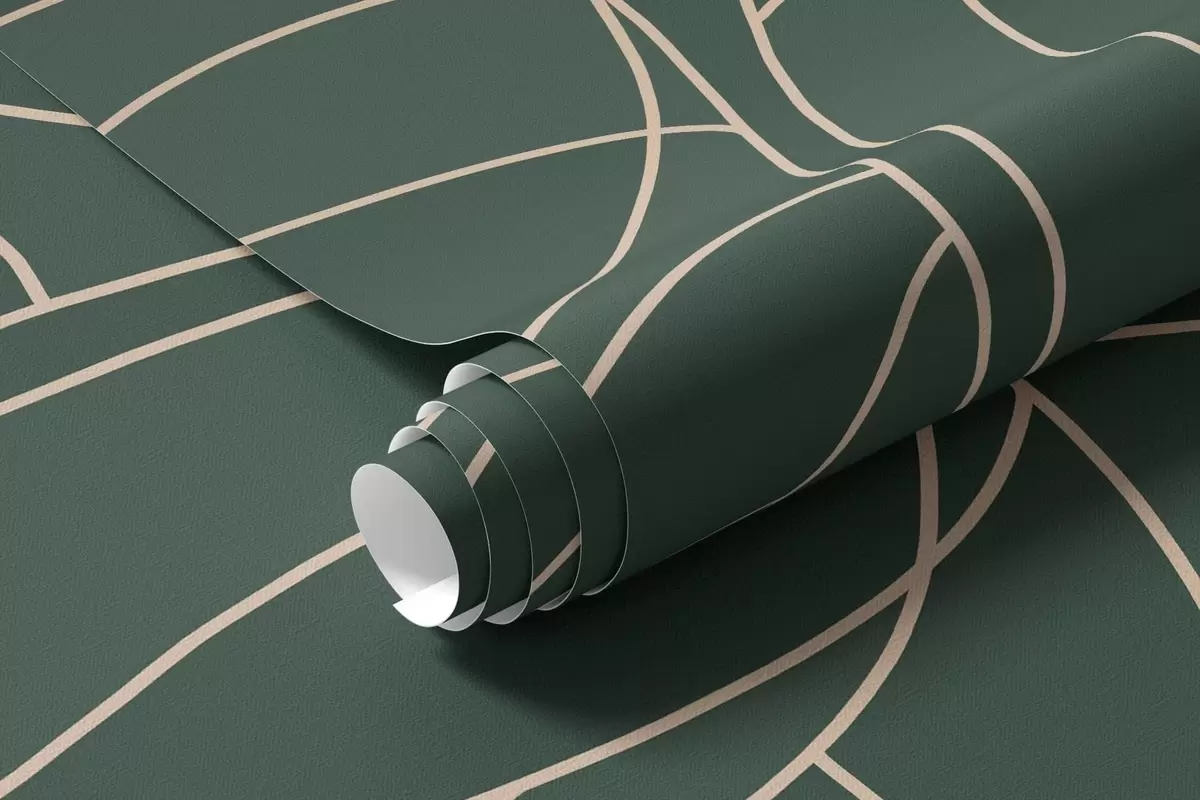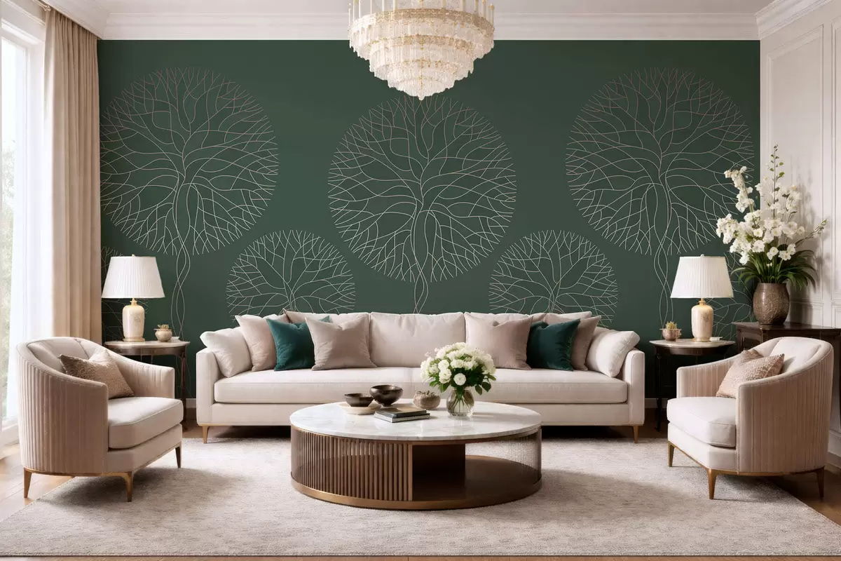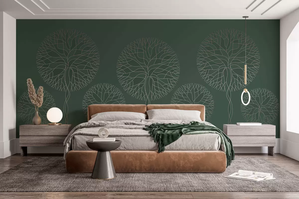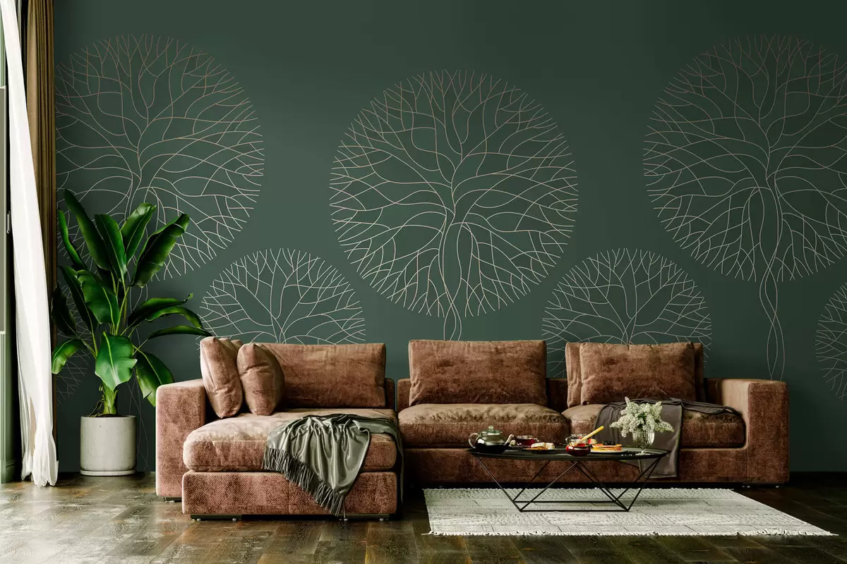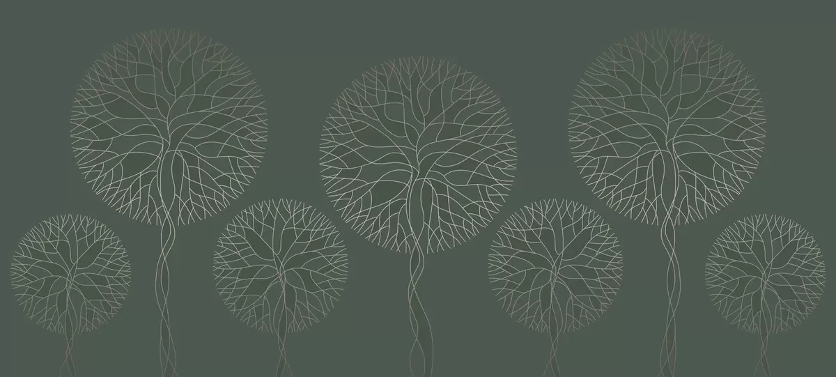 Papel tapiz Árboles lineales fantásticos con copas frondosas en elegantes tonos verde oscuro. Nr. w05213v2