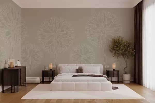 Papel tapiz Árboles lineales fantásticos con copas frondosas en tonos beige. Nr. w05213v3