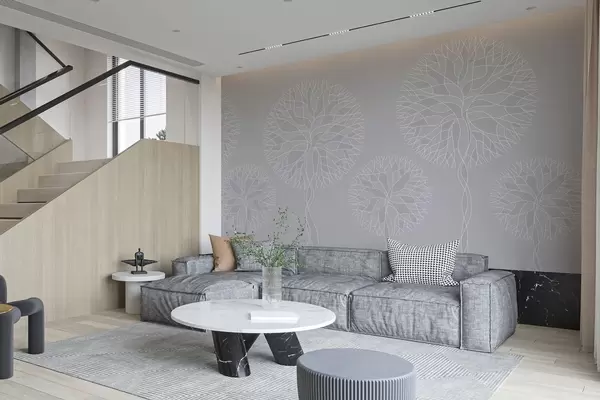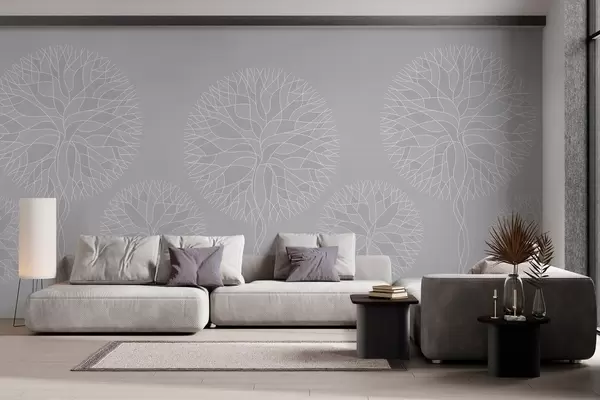 Papel tapiz Árboles lineales fantásticos con copas frondosas en tonos gris claro. Nr. w05213v4