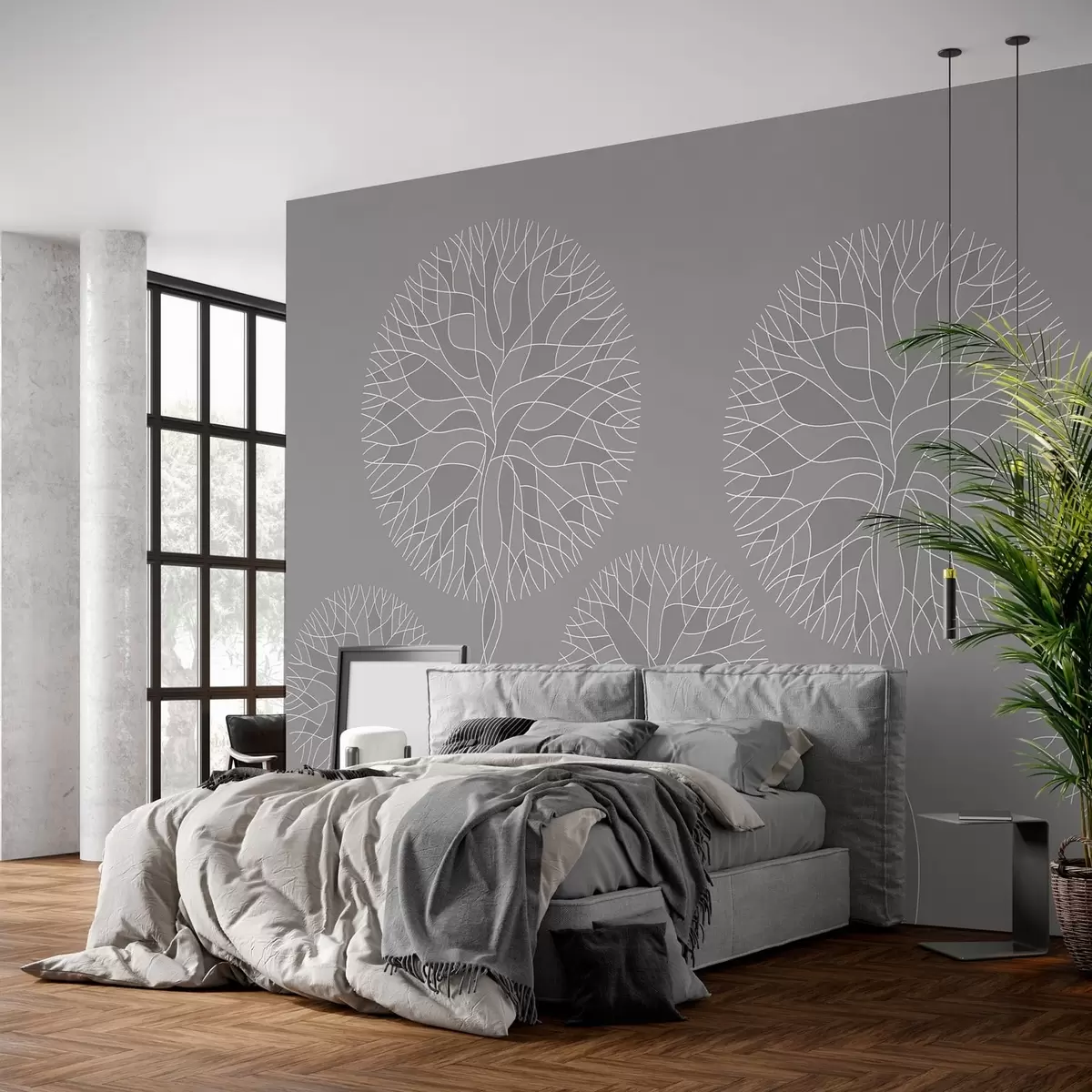 Papel tapiz Árboles lineales fantásticos con copas frondosas en tonos grises medios. Nr. w05213v5