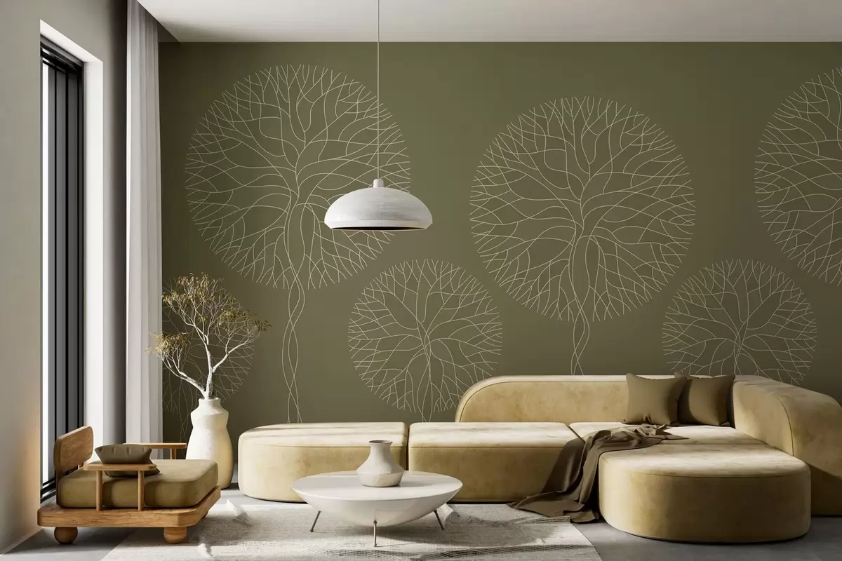 Papel tapiz Árboles lineales fantásticos con copas frondosas en tonos caqui. Nr. w05213v7