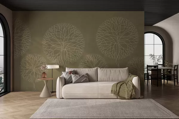 Papel tapiz Árboles lineales fantásticos con copas frondosas en tonos caqui. Nr. w05213v7